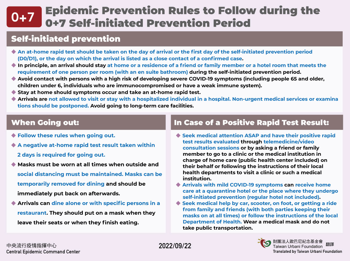 Taiwan to end quarantine and adopt 7-day self-initiated prevention policy for arrivals on October 13, for more information: https://www.cdc.gov.tw/En/Bulletin/Detail/nEBLnOPooDYFy_CBJqfWvg?typeid=158