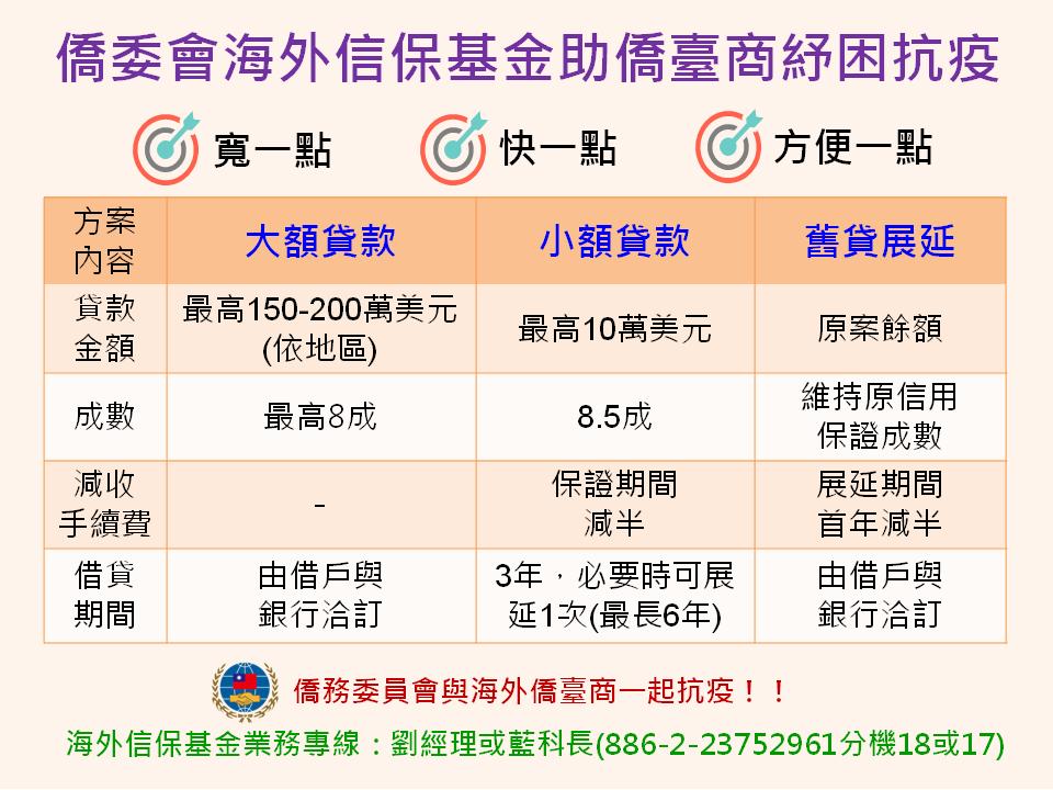 COVID-19(武漢肺炎)疫情對全球經濟造成影響,僑務委員會已輔導財團法人海外信用保證基金開辦「COVID-19(武漢肺炎)專案」,以協助受疫情影響發生營運困難的僑臺商事業渡過經營困境。該方案提供營收減少達20%之僑臺商事業擇一申請舊貸展延或小額新貸,由海外信保基金提供保證手續費減半優惠。