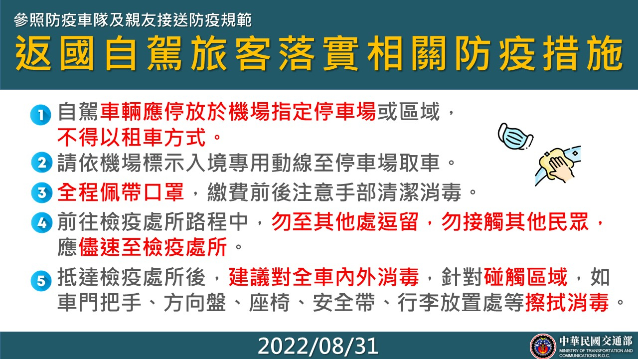 9月1日起,開放入境旅客可自行駕車前往檢疫處所,請返國欲自行開車前往檢疫處所的旅客務必遵守中央流行疫情指揮中心所訂的各項防疫規範,依機場指定動線至停車場取車,並儘速至檢疫處所,共同嚴守社區防線。