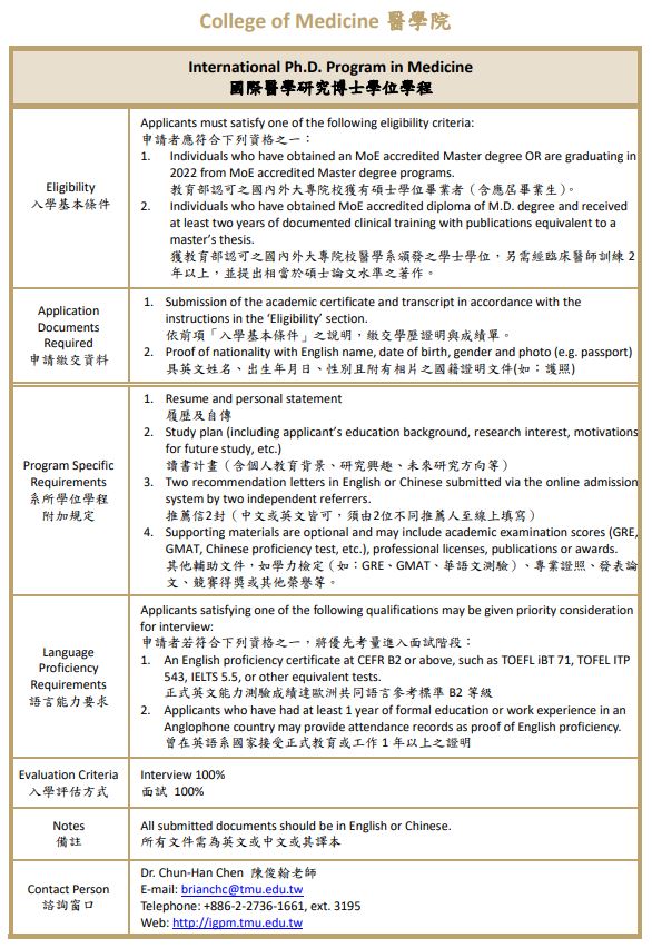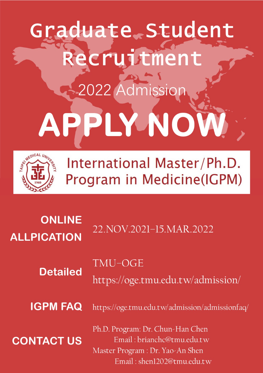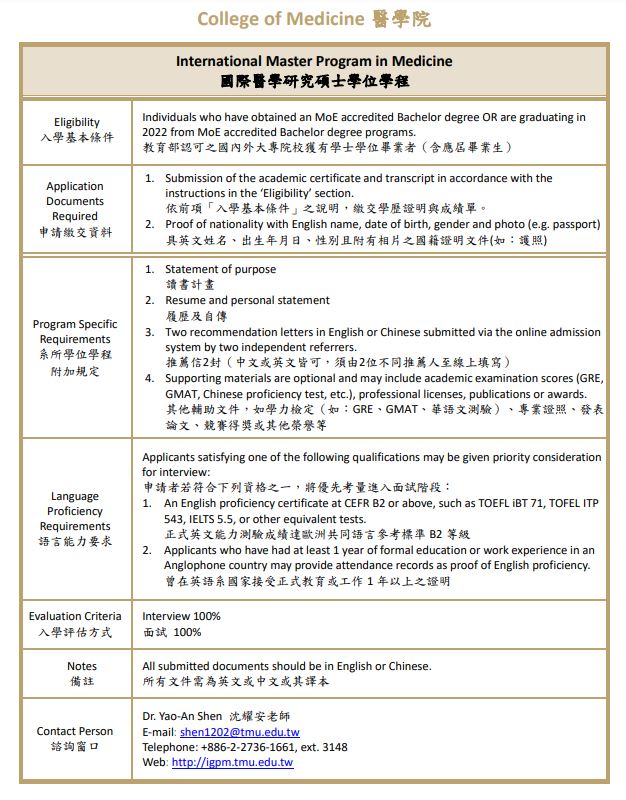 2022 International Master/Ph.D. Program in Medicine in Taipei Medical University.