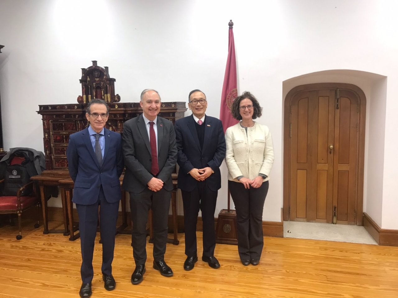 劉大使(右2)與Valladolid大學校長Antonio Largo Cabrerizo(左2)、副校長Paloma Castro Prieto(右1)及Ángel de Prado教授(左1)合影