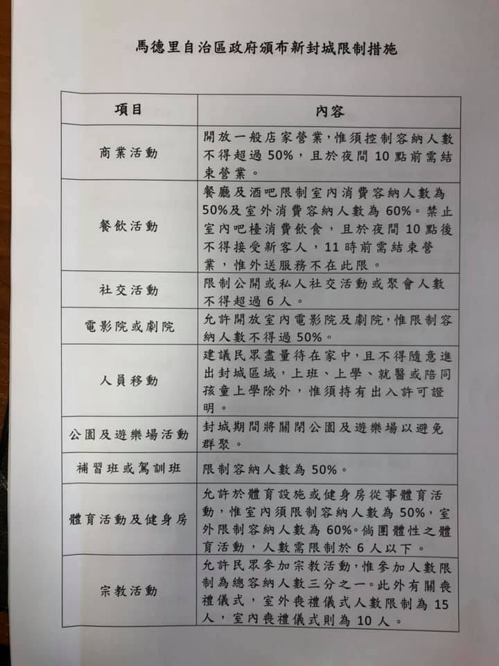 • 為有效遏止馬德里自治區疫情擴散蔓延,馬德里自治區政府10月2日於該自治區公報宣布自當日晚間10時起對首都馬德里市及其周圍Parla、Fuenlabrada、Alcobendas、Getafe、Torrejón de Ardoz、Alcorcón、Leganés、Alcalá de Henares及Móstoles等9個衛星城市實行14天封城限制措施,封城區域將不得隨意進出,惟上班、上學及就醫等不可抗力因素除外。鑒於馬德里自治區認為中央政府命令強制封城限制措施並無法律依據,已透過法旅途逕將封城決議提交法院進行判決,相關判決結果尚未出爐之前,倘未遵守相關規定將暫緩開罰,估計封城措施將影響480萬人。相關封城措施內容包括: