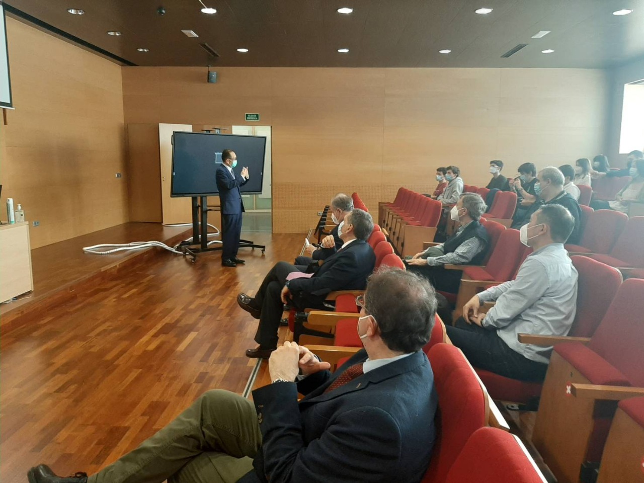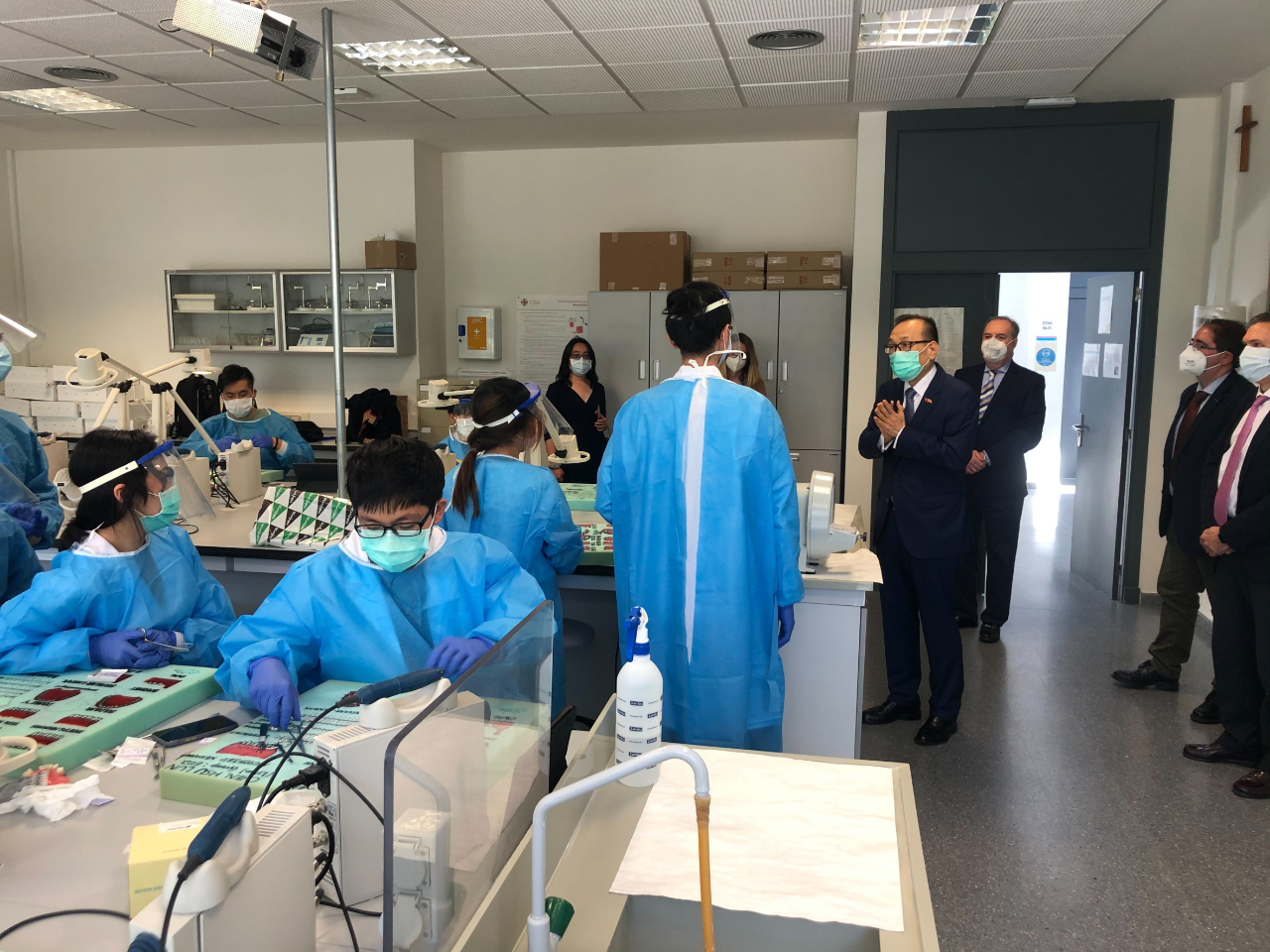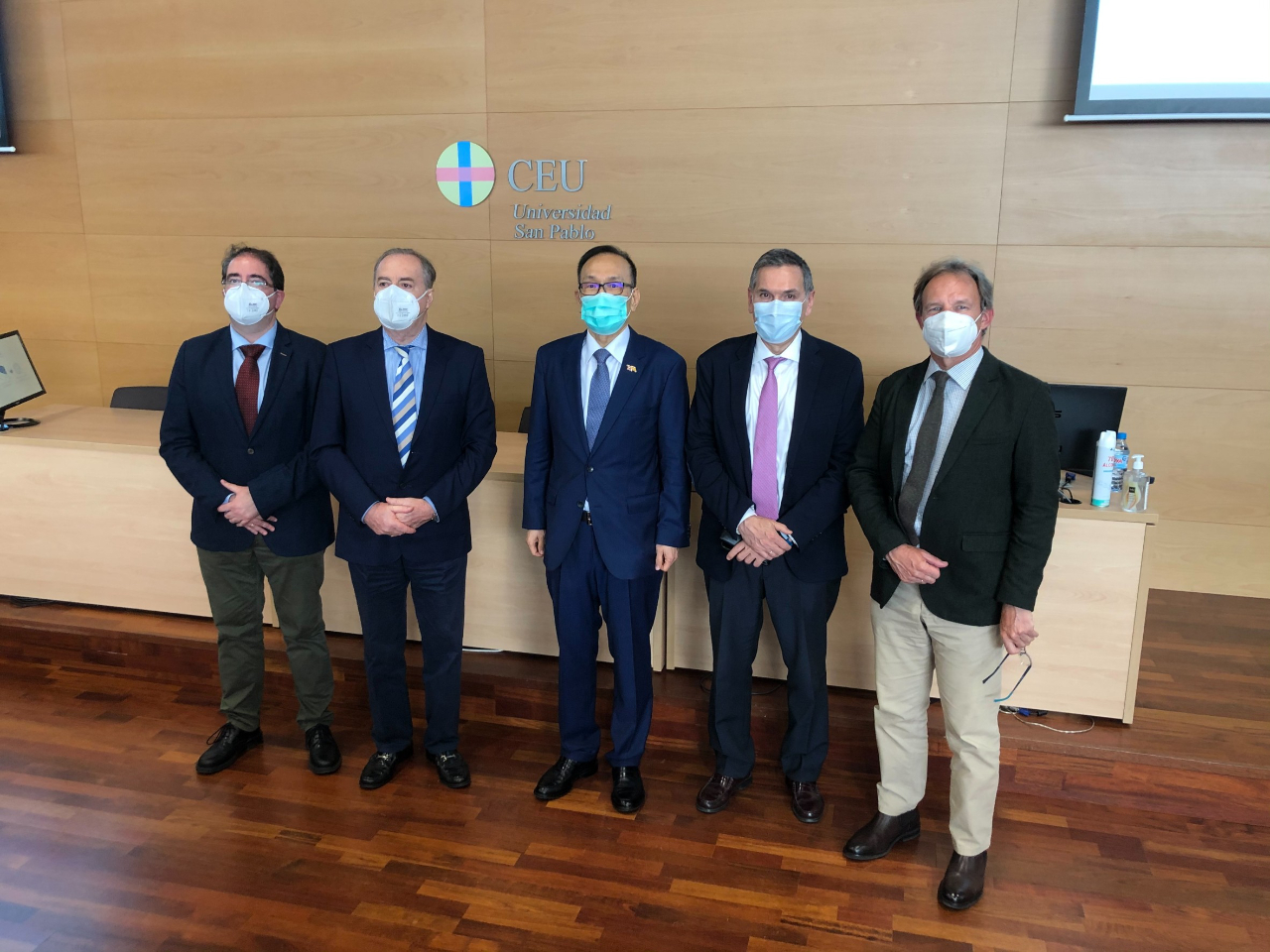 駐西班牙代表處劉大使德立曾於2020年11月26日應西班牙CEU大學聖保羅分校經濟系暨企業研究所(Facultad de Ciencias Económicas y Empresariales)教授Javier Morillas邀請赴該大學演講,於2021年5月5日再度應邀赴該校Montepríncipe校區(Campus Montepríncipe)演講及介紹臺灣。此外,目前我國有逾百名學生於該校牙醫系就讀,該校醫藥學院院長Tomás Chivato Pérez偕牙醫系系主任Sergio Portal Núñez陪同劉大使訪視我國逾30位牙醫系三年級學生上課情形;劉大使除鼓勵學生把握學校豐富資源努力學習外,並請渠等注意加強防疫,另向CEU校方爭取學生即早接種新冠疫苗事。C院長復以,該校牙醫系5年級學生均已完成接種,其餘年級學生亦均已列入接種計畫,預計本年暑假結束前完成牙醫系所有學生疫苗接種。