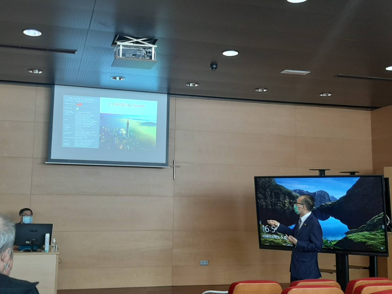 劉大使於簡報後與現場師生進行問答交流,內容包括我國教育制度、我國天然資源及臺西高科技之合作交流等。劉大使簡要說明我國公私立教育現況,並強調我國半導體高科技居全球領先地位,如我國及半導體高科技產業發展先進,2020年臺灣晶片之全球市占率高達63%,僅臺積電公司(TSMC)即占全球晶片市場54%,臺灣為全球晶片第1大供應國;日前西國新聞消息指出,西國汽車業由於晶片短缺,將可能造成4萬名勞工需向政府申請無薪假補助措施(ERTE);而我國半導體產業得享今日成功,除政府之提前部署及挹注資金外,優秀科技人才及高素質之勞動力均為主要因素之一。