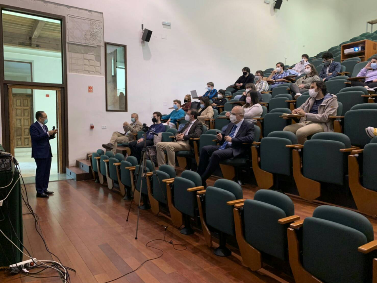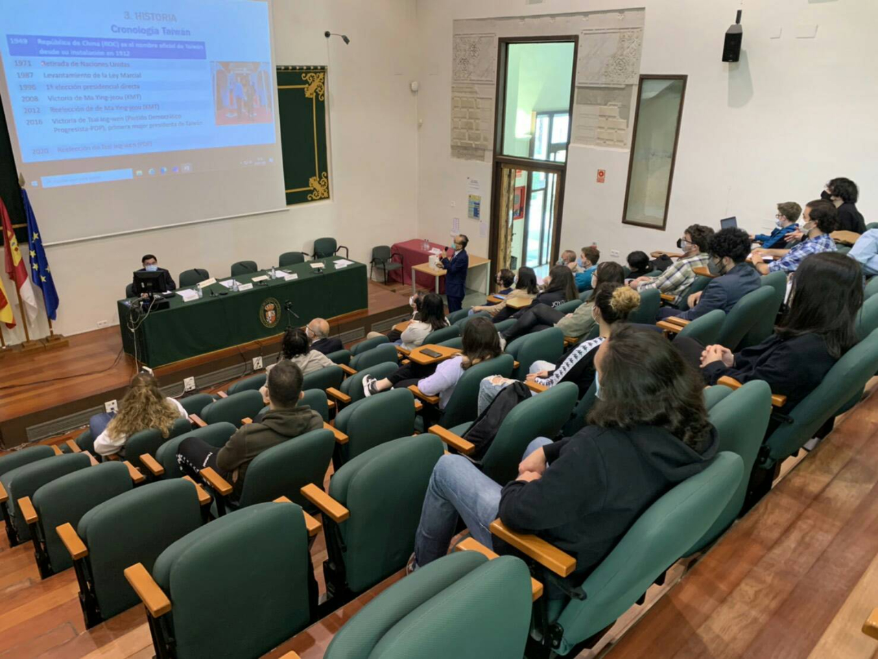 由於疫情要求之社交距離,該校約50名學生以實體與會及透過視訊分為二組參與劉大使演講。劉大使於演講中介紹(1)我國建國以來發展沿革、經貿發展、兩岸關係及美、歐盟加強對我支持、籲請支持臺歐盟洽簽雙邊投資協定(BIA)等。劉大使強調,臺灣已與日本、菲律賓、印度及越南簽署BIA,並與新加坡及紐西蘭簽署經濟夥伴協定,歐盟應加速與臺灣啟動BIA談判,以全面發展歐盟與亞太地區之投資與鏈結,提升歐盟之戰略自主性;(2)說明我國5+2產業、推廣我國攬才(Contact Taiwan)政策及循環經濟發展,劉大使進一步舉我國檸檬全果循環產業生態系統,透過生質材料及微生物工程等高科技,將檸檬剩餘之果渣提煉為精油、果膠及有機酸等,以製成食品、清潔用品、飼料及肥料等;另將黃豆渣加工後製成素料食品、乳牛飼料、貓砂及肥料等之循環經濟實例;(3) 我國至5月13日止新冠肺炎(COVID-19)感染人數計1,256人,死亡人數12人,防疫成果全球有目共睹,我防疫成功5大要素為具抗SARS經驗、反應快速、科技運用、資訊透明及全民合作等,臺灣各項防疫指標為全球最佳範例之一,爰呼籲支持我國加入即將於本年5月24日至6月1日舉行之世界衛生大會及聯合國其他各項組織;(4)我國提供獎學金及觀光交流情形;(5)臺西產業合作、經貿關係現況及主要進出口產品,其中西國豬肉(含火腿)、橄欖油、葡萄酒為明星產品;本處積極促進雙邊貿易,推動西國農牧產品輸銷,以尋求平衡雙邊貿易,創造互利共贏。