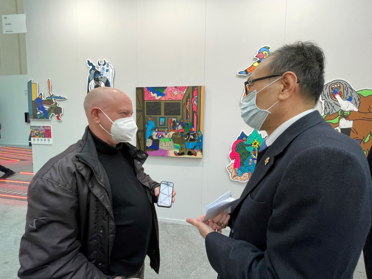駐西班牙代表處劉德立大使本(2)月24日參訪我國「馬德里臺灣藝術週」-伊日藝術於馬德里藝術博覽會(Art Madrid)舉辦的張騰遠展覽。劉大使首先感謝伊日藝術計劃協助辦理本(111)年度「馬德里臺灣藝術週」活動,並費心將藝術家張騰遠及王煜松相關作品運至展場。惟受疫情影響,張騰遠及王煜松無法親自前來馬德里,由伊日藝術計劃楊庭鑒經理代為向劉大使介紹本次展出作品。劉大使認為《鸚鵡人仕女》作品不僅連結臺西兩國,同時對於藝術家欲呈現的時下數位成癮現象深表讚賞。另西國主流媒體「西班牙外交官電子報」(The diplomat in Spain)創辦人Alberto Rubio亦於現場專訪,劉大使除向R創辦人介紹藝術家張騰遠的作品特色,並說明文化軟實力對於臺西交流的重要性,現場氣氛融洽。