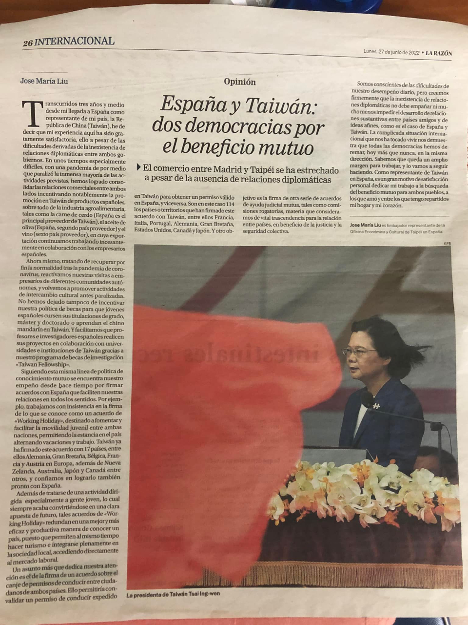 西班牙主流媒體「道理日報」(La Razón)於本(6)月27日全版刊登駐西班牙代表處劉大使德立以-「西班牙與臺灣:追求互利互惠的兩個民主國家」為題投書,內容如下: