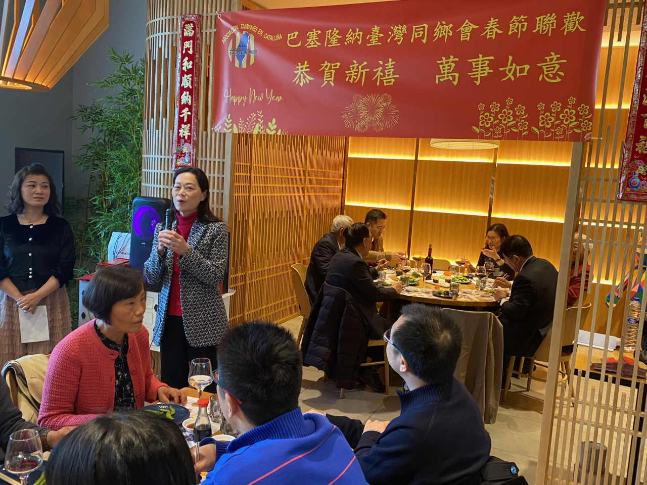 餐會開始首先由巴塞隆納臺灣同鄉聯誼會王昭雯會長致詞歡迎所有參加活動人士,並感謝張大使不辭辛勞遠到前來巴塞隆納,顯示對旅居巴塞隆納僑胞的重視及關懷。另黎萬棠會長暨諮詢委員及李志俊僑務委員亦分別上臺祝在場鄉親新年快樂。
