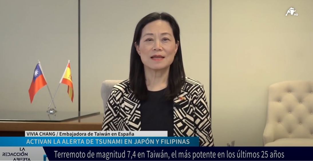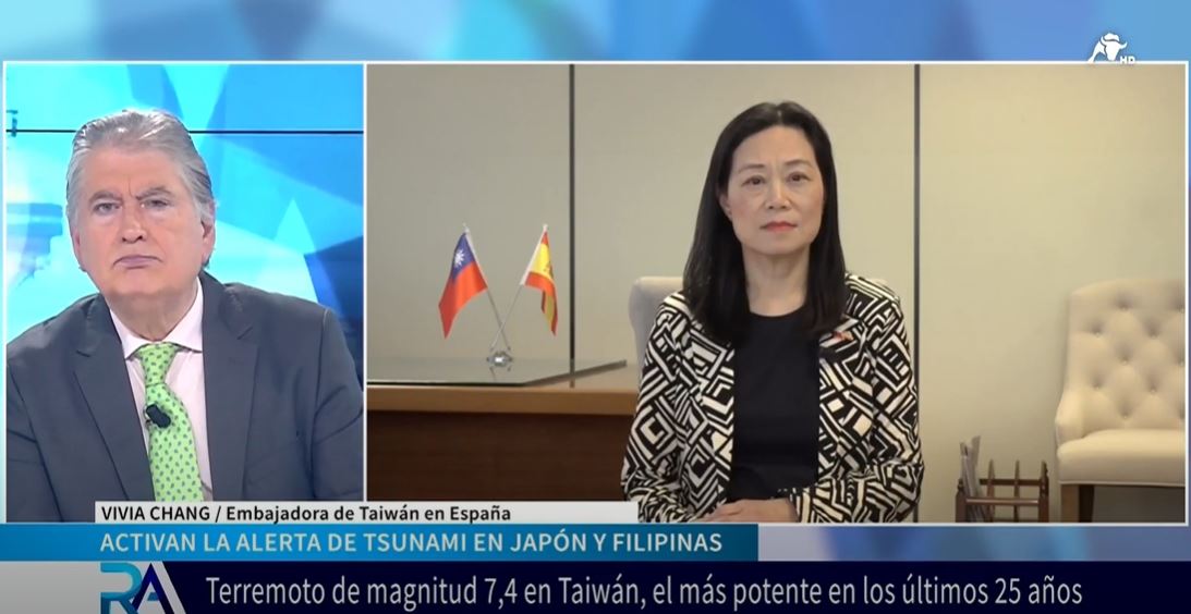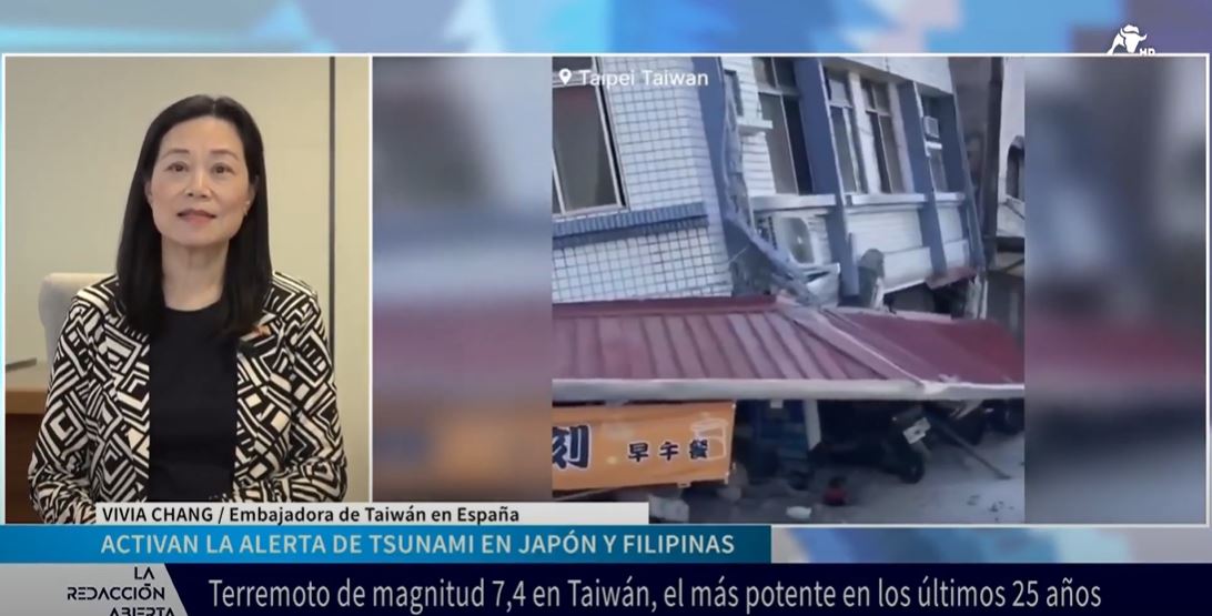 我國昨(3)日早發生規模7.2級強震引發國際關切,「西班牙國家廣播電臺」(RNE)及「鬥牛電視臺」(El ToroTV)專訪張俊菲大使說明強震災情、我國政府緊急應變處置作為,掌握黃金救援時間進行搜救工作,並轉達我政府與人民感謝國際社會及西國各界對臺灣花蓮強震之關切慰問與伸援。