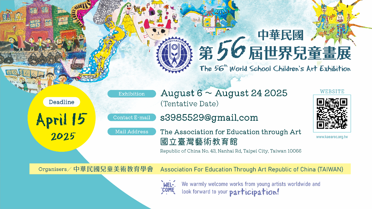 La 56ª Exposición Mundial de Arte Infantil Escolar se celebrará del 6 al 24 de agosto de 2025 en Taipéi, República de China (Taiwán). Esperamos contar con su participación.
