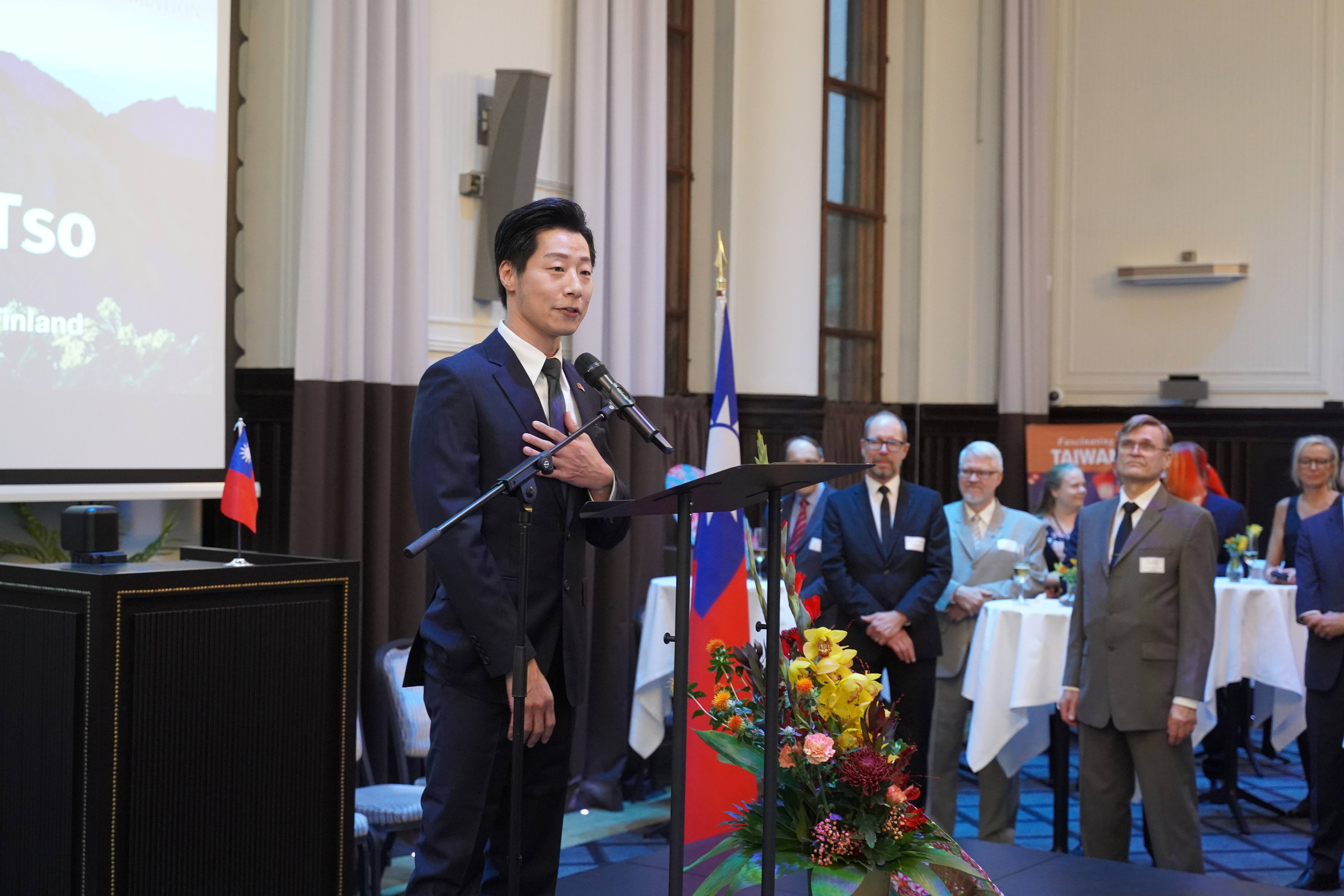 駐芬蘭代表林昶佐致詞表示,芬蘭人常被外界形容為內斂民族,但從他過去的音樂工作到派駐芬蘭的經驗,深刻瞭解到芬蘭人其實是開放而熱情的民族,在與芬蘭官員和國會議員會晤時,雙方的討論議題涵蓋區域安全和民主韌性合作,芬蘭以建設性與前瞻性的方式表現出與台灣接觸的強烈意願,對此他深表感謝。