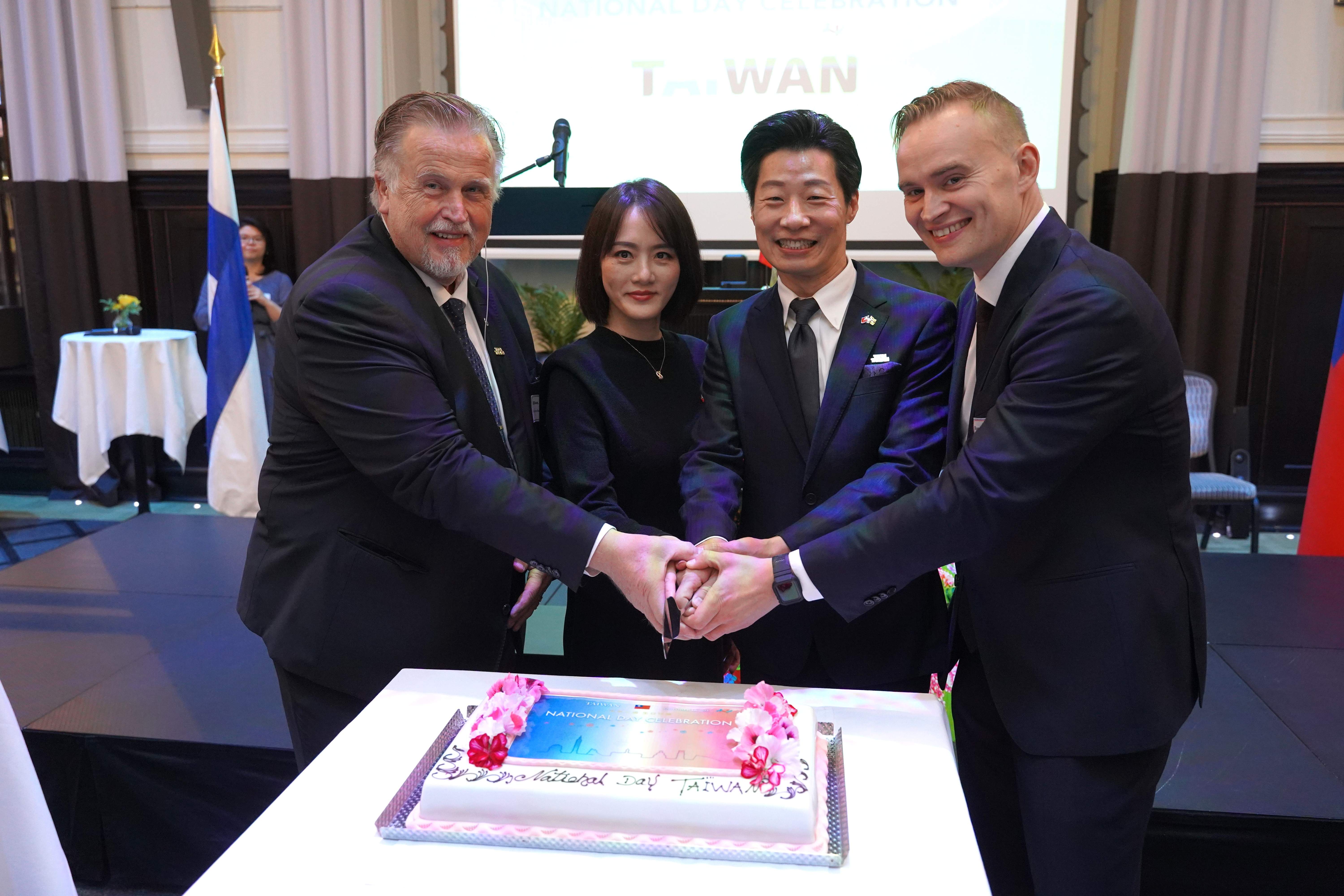 駐芬蘭代表處代表林昶佐夫婦與芬蘭國會友台小組第一副主席哈雅內(Atte Harjanne,右一)及第二副主席聶米(Veijo Niemi,左一)國慶酒會共同切下國慶蛋糕。