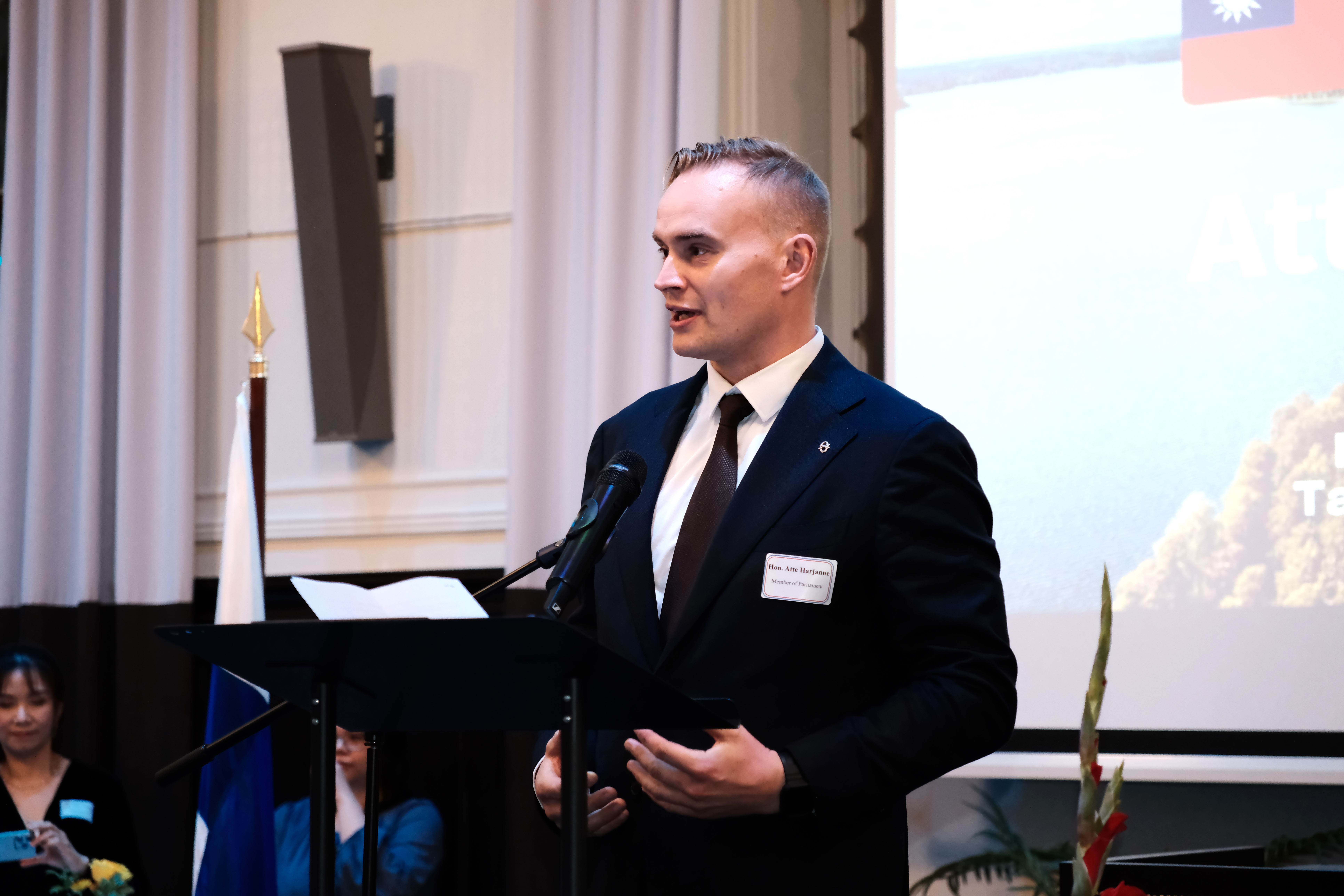 芬蘭國會友台小組第一副主席哈雅內(Atte Harjanne)在國慶酒會中致詞