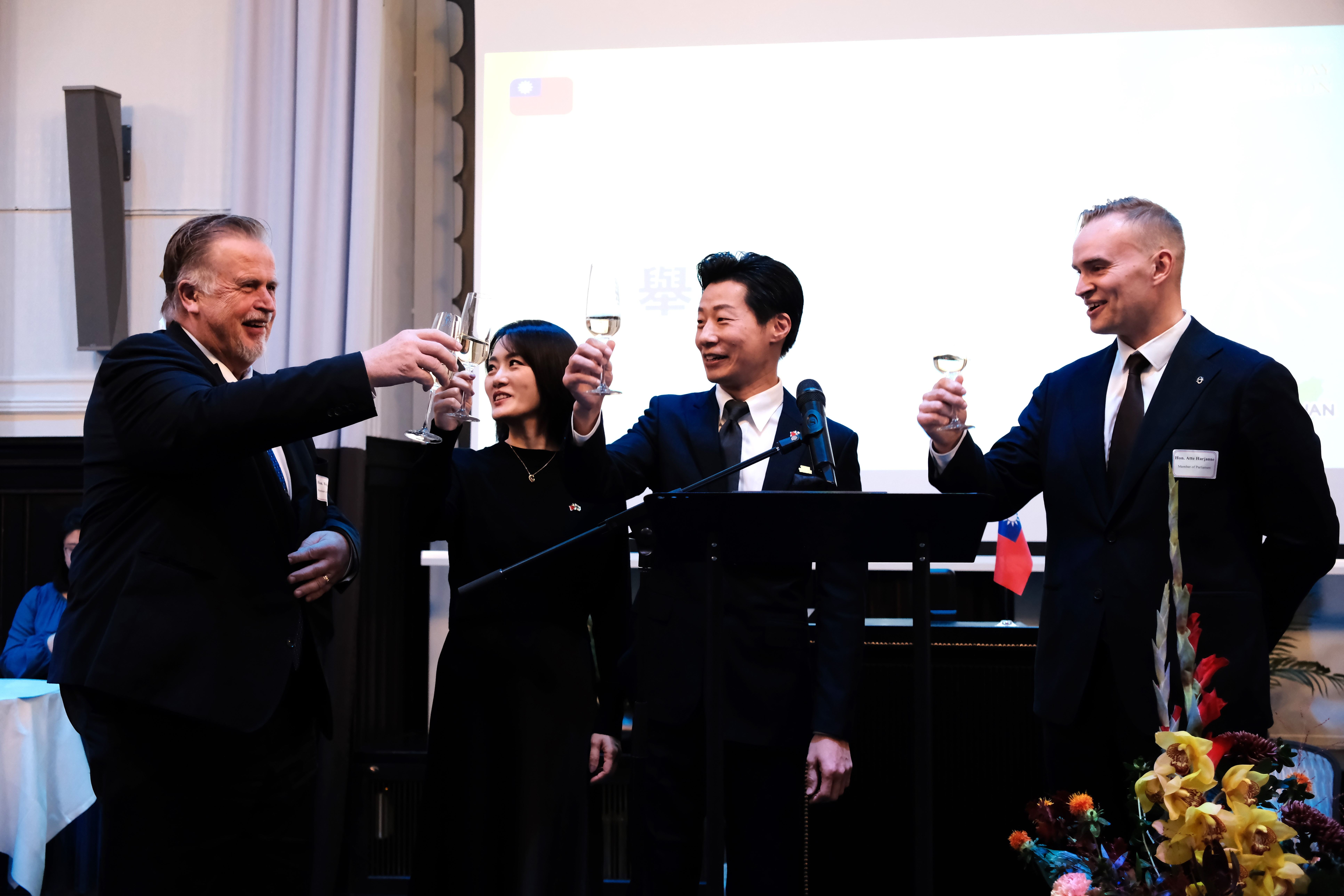 駐芬蘭代表處代表林昶佐夫婦與芬蘭國會友台小組第一副主席哈雅內(Atte Harjanne,右一)及第二副主席聶米(Veijo Niemi,左一)在國慶酒會舉杯向出席嘉賓致意
