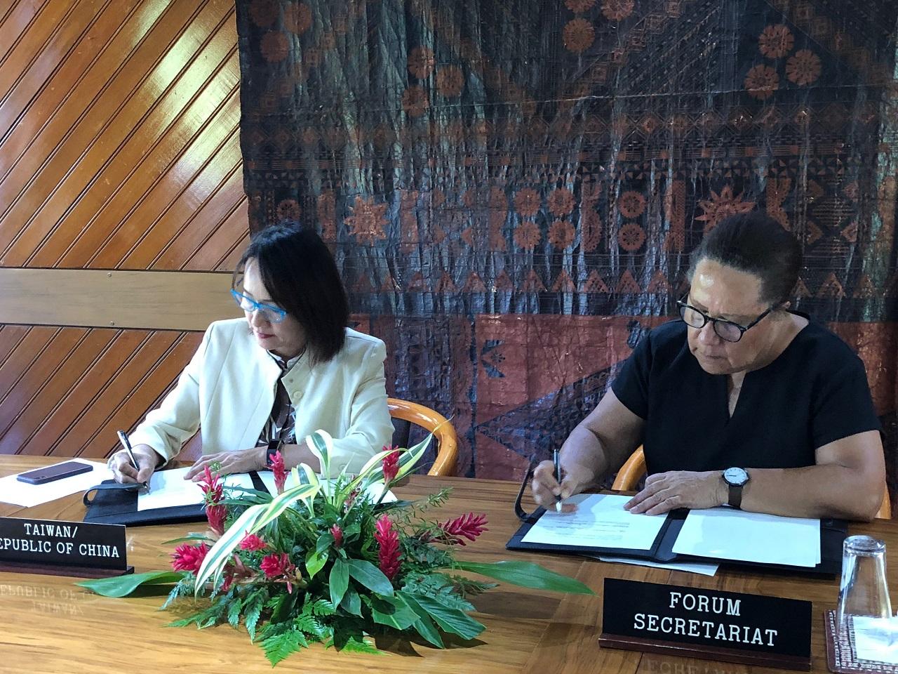 駐斐濟大使黎倩儀代表政府與太平洋島國論壇秘書處(Pacific Islands Forum Secretariat, PIFS)簽署合作協定並捐贈獎學金合作計畫款50萬美元,由論壇秘書處秘書長梅格泰勒(Dame Meg Taylor)代表接受。