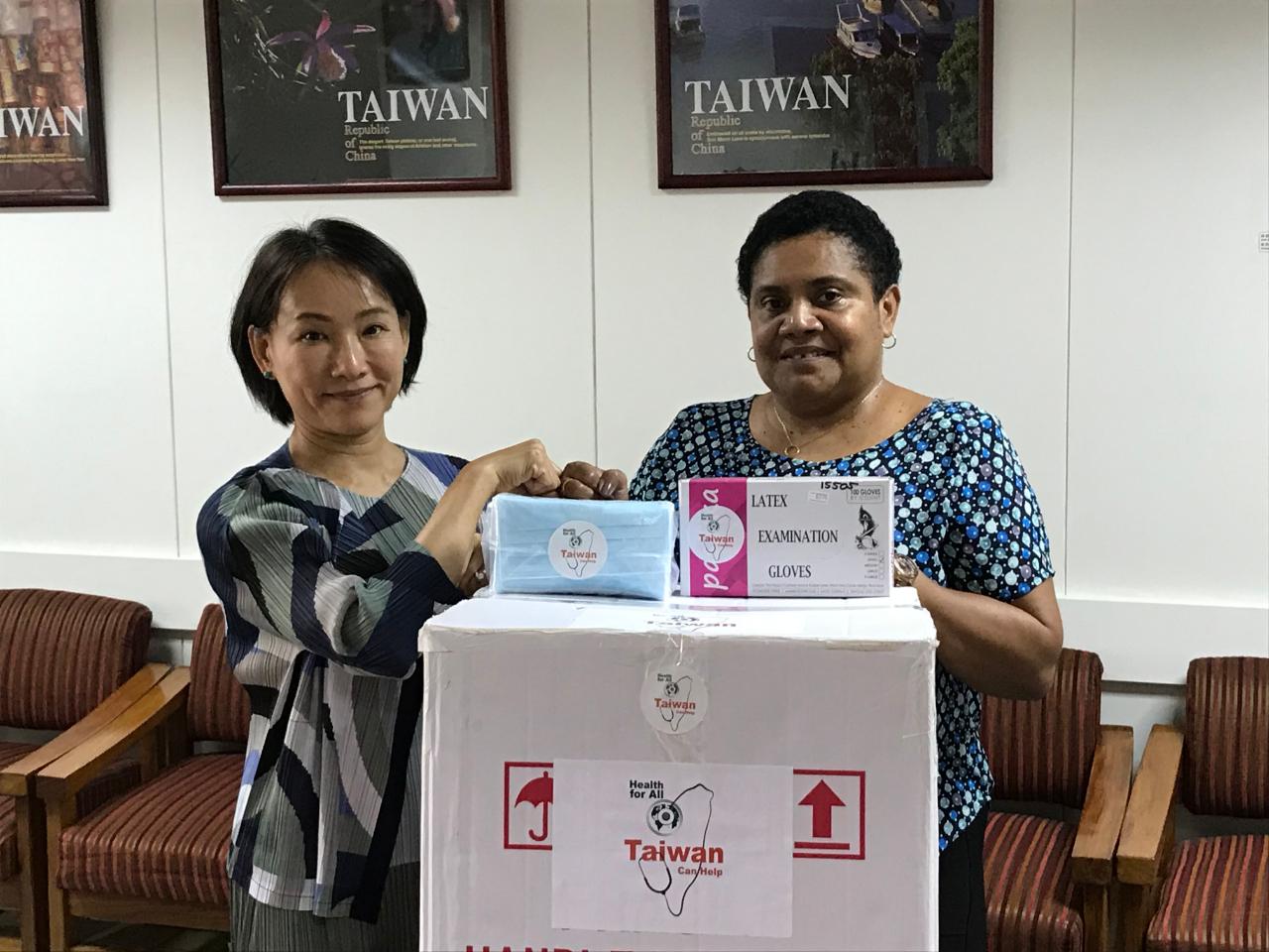 駐斐濟代表處黎倩儀代表於2020年5月15日向「太平洋島國新聞協會」(PINA)主編Makereta Komai女士贈交1,000片口罩和500副防護手套。