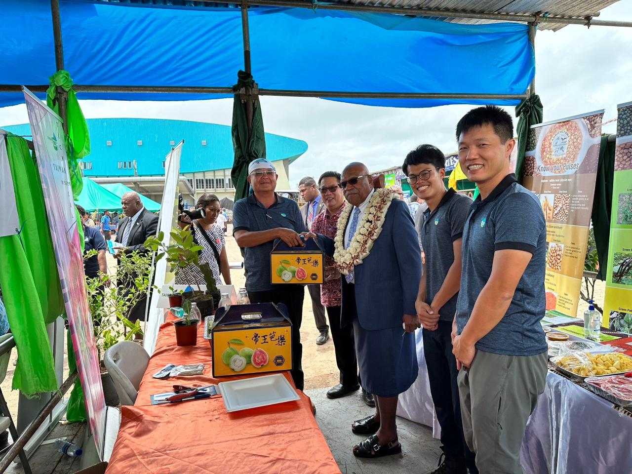 由駐斐濟台北商務辦事處支持與督導的中華民國(臺灣)駐斐濟技術團,本(112)年10月25日應斐濟農業部邀請參加全球糧食日及斐濟全國農業展慶祝活動的開幕典禮及展覽,斐濟總理欒布卡(Hon. Sitiveni Rabuka)在農業部長Hon. Vatimi Rayalu陪同下至技術團攤位參觀並品嘗由技術團輔導栽種的番石榴,並表讚賞,技術團並致贈欒布卡總理番石榴1箱。此外,技術團亦應斐濟農業部所請提供番石榴禮盒,有欒布卡總理於開幕典禮中致贈其他參加的現場貴賓。