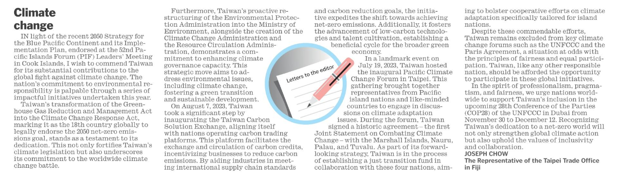 駐斐濟代表周進發投書斐濟第一大報呼籲各界支持台灣參與COP28 - 駐斐濟臺北商務辦事處 Taipei Trade Office in Fiji ::: 跳到主要內容區塊
