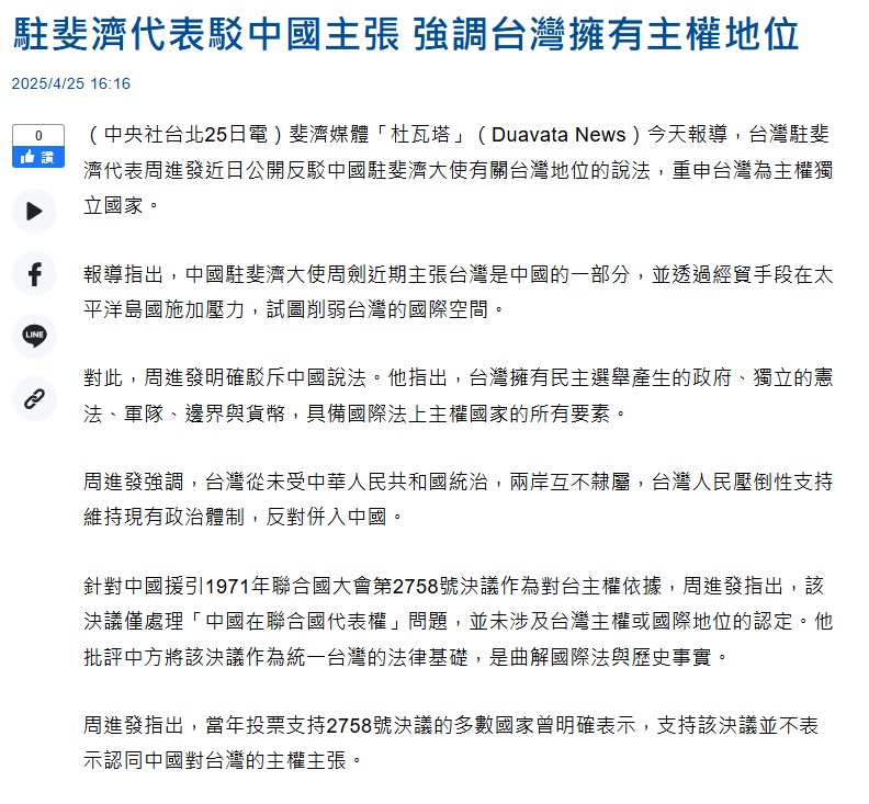 (中央社台北25日電)斐濟媒體「杜瓦塔」(Duavata News)今天報導,台灣駐斐濟代表周進發近日公開反駁中國駐斐濟大使有關台灣地位的說法,重申台灣為主權獨立國家。