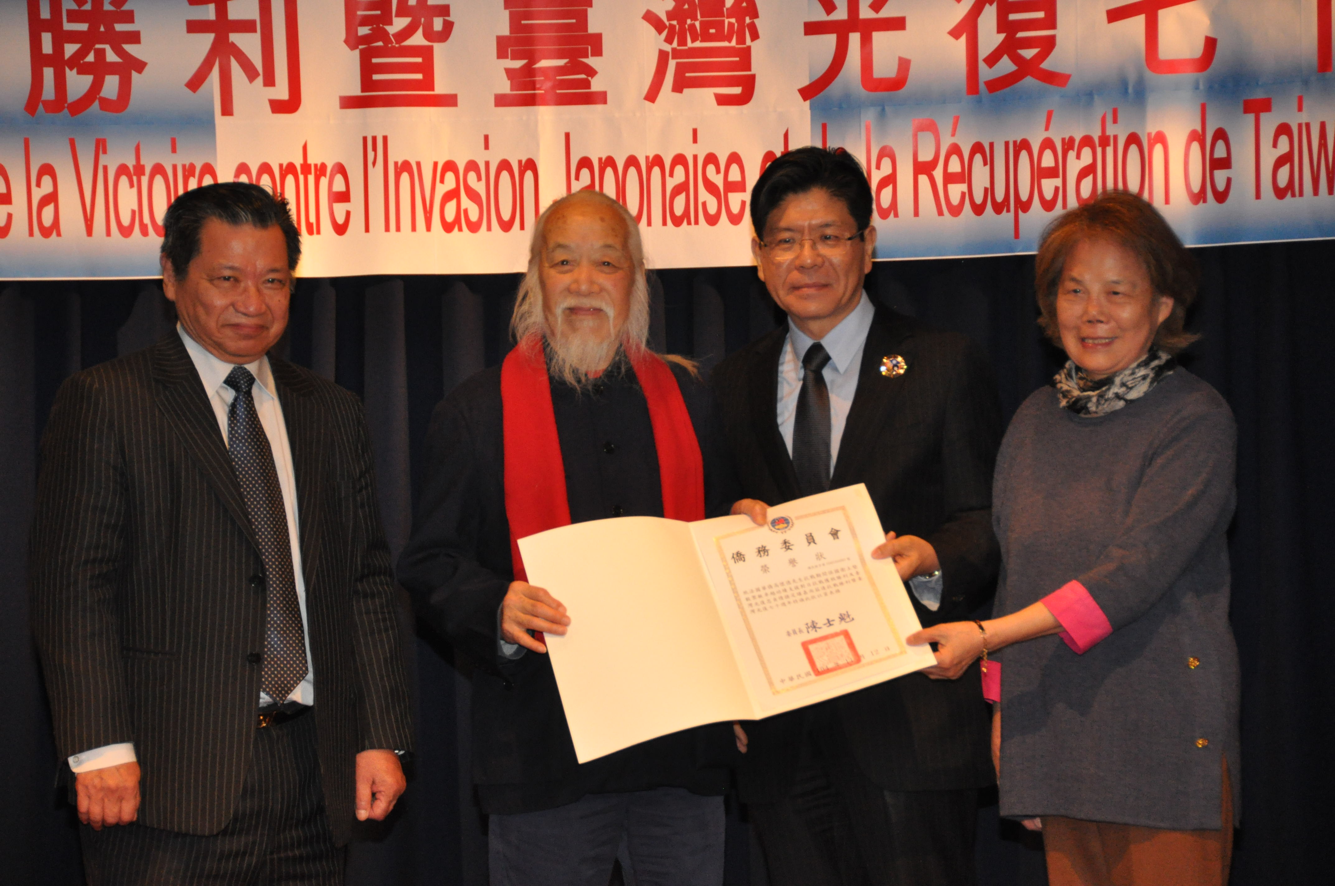 稍後,法國中山學會丁偉星會長以及歐洲梅蘭協會詹致遠總會長亦先後主講 「全民八年抗戰史實」及「被忽視的史實暨永續和平的建設」;主辦單位並於議程中並穿插播放<破曉時分>、<紀念中華民國對日抗戰勝利七十週年>等史實紀錄片,用影音畫面進一步為大家說明、還原中華民國當年對日浴血抗戰的壯烈歷史。為了表揚抗戰先烈、先賢為國為民犧牲奉獻的精神典範,張大使嗣亦代表僑務委員會逐一頒發榮譽狀予黃歡笑、高生道、林雨水、饒家駒、高正明、周訓典、李次白、詹劍青、張世德等先烈旅法遺族以及旅法老兵佘萬先生及高懷德先生,為活動帶來高潮,會場掌聲不斷;受頒人員備感光榮。