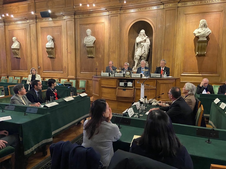 本次典禮在法蘭西自然科學院Grande Salle des Séances禮堂舉辦,由國科會吳政忠主任委員、駐法代表處吳志中大使、法蘭西自然科學院院長Patrick FLANDRIN共同主持。自然科學院國際事務副院長Francis-André WOLLMAN、終身秘書Etienne GHYS、數位院士、法國國家研究總署署長Thierry DAMERVAL及相關部會代表等,亦特地蒞臨支持,場面隆重而盛大。典禮首先由F院長開場致詞,介紹臺法科技獎設立緣由,並表示法方非常重視臺法科技獎,該獎項歷經24屆,已孕育許多科研貢獻突出的臺法研究團隊。吳主委則表示科學對人類社會發展具重要貢獻,它引領人類走出黑暗時代,走向當今社會的繁榮。主委並讚賞臺法兩國在共同堅持研究發展自由之共同價值下,發展迄今超過30年之緊密科研夥伴關係;同時感謝兩國研究人員多年來持續不懈的合作追求科研卓越。最後,吳大使致詞時則強調,此獎項除為臺法科研合作最高榮譽且歷史悠久外,本年頒予對我國極具意義的半導體元件開發應用的兩位得獎人,已為臺法未來在半導體領域深化合作跨出第一步。未來,盼兩國在科研學術基礎上,有機會進一步朝半導體產業應用合作邁進。