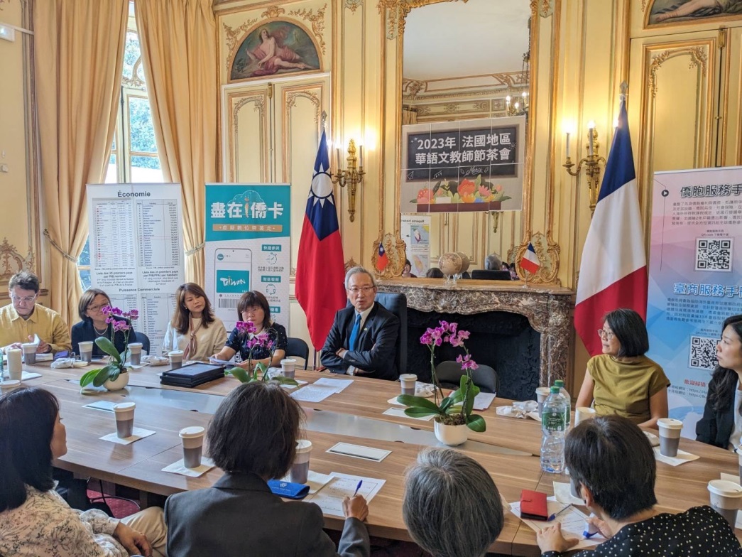 為感謝海外華語文教師辛勞,駐法國代表處僑務組於9月28日教師節舉辦「2023年法國地區華語文教師節茶會」,由吳大使志中主持,邀請法國地區僑校校長、教師、臺灣華語文學習中心負責人,以及在主流中小學任教的臺籍教師們一同歡慶教師節。