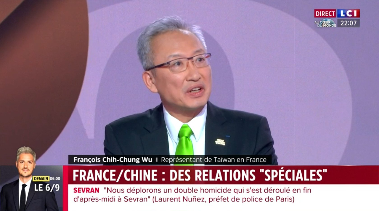 吳大使應邀於本(5)月5日晚間10時參與法國新聞台收視率最高的「法國電視第一台新聞台」知名主播Darius Rochebin與Alexia Mayer共同主持之習近平訪法特輯報導,同台與談人計有「費加洛報」(Le Figaro)總編輯Guillaume Roquette、LCI電視台軍事顧問Michel Goya上校、戰地記者暨國際問題專家Anne Nivat等人,討論內容包括習近平訪法之利害關係、習可否使普丁侵烏立場軟化、法中特殊關係、中國壓迫新疆維吾爾族及西藏人權問題、台海情勢等。