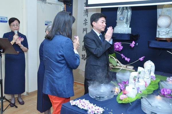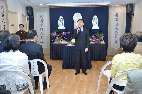 慈濟基金會法國聯絡處負責人黃行德僑務諮詢委員致詞時表示:本年欣逢慈濟50週年,聯絡處特別舉辦此三節合一孝親禮佛典禮,邀請大家透過虔誠浴佛,感念佛恩,讓法水洗滌心靈。他指出慈濟人始終秉持證嚴上人「淨化人心,社會祥和」的開示,力行「法入心、法入行」,除了勉勵在座會眾以虔誠的心齋戒,遵循法脈,共同禮佛,祈願台灣眾生平安吉祥,天下無災無難,同時祝福天下所有母親「母親節快樂!」
