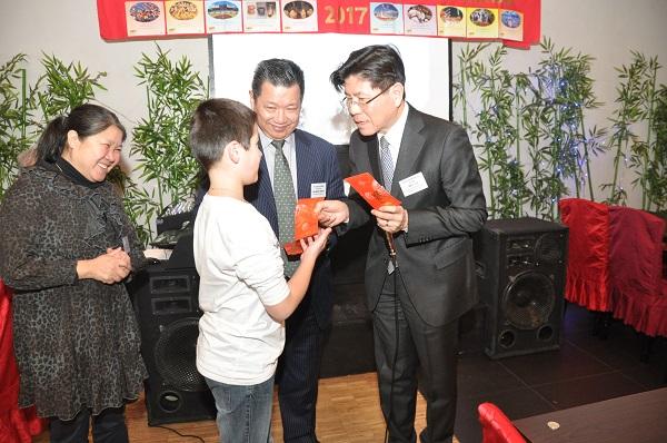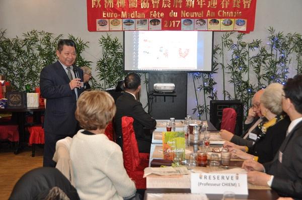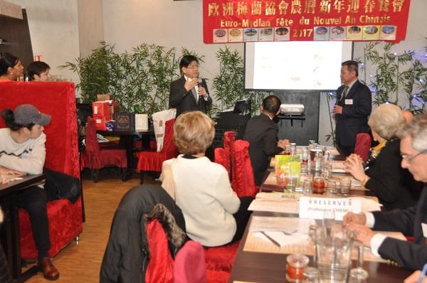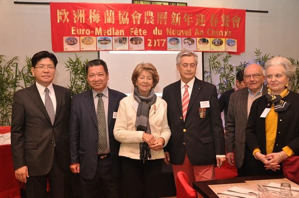 歐洲梅蘭協會總會於2月19 (星期日)中午12時30分假法國南特(Nantes)市美食城酒樓(Restaurant "Délices du Monde" )舉辦「農曆丁酉雞年迎春餐會」活動。中華民國駐法代表張銘忠大使偕僑務組林宏穎組長及政務組黃上益副組長專程自巴黎前往參加盛會,向包括法國前參議員兼友臺小組榮譽主席巴蓬(Monique PAPON)女士、瑞典皇家駐法國南特名譽領事胡菲爾 (Dominque van HUFFEL) 先生在內的80餘位法國友人及鄉親們賀年,並轉達政府的關懷與重視之意,受到熱烈歡迎。 歐洲梅蘭協會總會會長詹致遠教授首先致詞恭賀年禧,他強調:該總會决定將 2017年的「丁酉雞年迎春餐會」 命名為「低碳社會的新春宴會」,以展現該會為搶救「地球村生態」及為解决全球暖化各類問題做出少許貢獻的决心,祈求將來能把一個更安詳、更健康、更公平的社會交給未来的子子孫孫。最後,教授並衷心祝福大家闔家安康,萬事如意! 巴蓬女士嗣亦應邀致詞,祝大家新年好!除了感謝在座臺灣的好朋友們熱情邀請與款待,亦歡迎張大使一行遠從巴黎趕來南特和大家共同歡慶新年。她特別指出:蔡英文總統很重視環保,寄望她繼續在此一議題上和法國及美國保持良好溝通,為人類的末來攜手努力;另亦強調:法國人和臺灣人民一樣重視臺灣的自由民主,祝願中華民國永續繁榮昌盛。 張大使旋亦代表政府祝福各界先進新年萬事如意,心想事成!感謝在座嘉賓年來對於中華民國臺灣的支持,亦肯定歐洲梅蘭協會聯繫服務同僑、協促臺法文化及科技交流之績效顯著。大使進一步表示:今年適逢雞年,法文使用陽性的le coq,與法國象徵相同,中文的「雞年」其實不分性別,且「公雞」「母雞」並重,也反映今日臺灣的兩性平權現況,謹以此向在座女性,包括巴蓬參議員在內的所有女性致敬,亦感謝大家認同臺灣、疼惜臺灣。 貴賓致詞暫告段落後,詹教授援例邀請張大使、巴蓬女士、歐洲梅蘭協會大巴黎分會長羅強會長領唱<梅花>及會歌<梅蘭,梅蘭,我愛你>,旋並宣布豐盛的自助餐敘開始。席間,詹教授除了簡報歐洲梅蘭協會過去一年來推動各項會務與活動的概況與成果,亦穿插播放「維護地球童歌紀錄片-家(Home)」片段,並領唱法文環保歌曲<地球真美!>(La Terre est si belle!)。稍後,張大使應邀與詹教授一起發給小朋友新年紅包,並於餐會壓軸節目中抽獎送出華碩精美平板電腦,場面熱絡歡騰。當日活動最後在眾人合唱<友誼地久天長>(Ce n’est qu’un au-revoir)的歌聲中劃下完美句點;與會各界人士皆對主辦單位籌辦大型春節活動的辛勞與用心給予高度肯定,咸表示類此活動有助於讓與會鄉親及法國友人更加瞭解及支持臺灣。