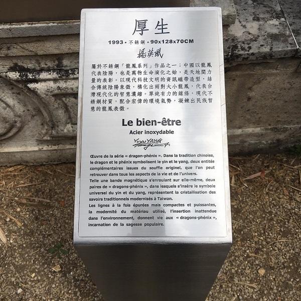 張大使隨後與王館長共同為「厚生」舉行說明立牌揭牌儀式,作為台灣藝術家在法國「承先啟後」的象徵,立牌中文說明文字如次:「厚生」屬於不鏽鋼「龍鳳系列」作品之一;中國以龍鳳代表陰陽,也是萬物生命演化之始,是天地間力量的表彰。以現代科技文明的資訊磁帶造型,結合傳統陰陽象徵,構化出兩對大小龍鳳,代表台灣現代化的智慧濃縮。單純有力的線條,現代不銹鋼材質,配合宏偉的環境氣勢,凝煉出民族智慧的龍鳳象徵。