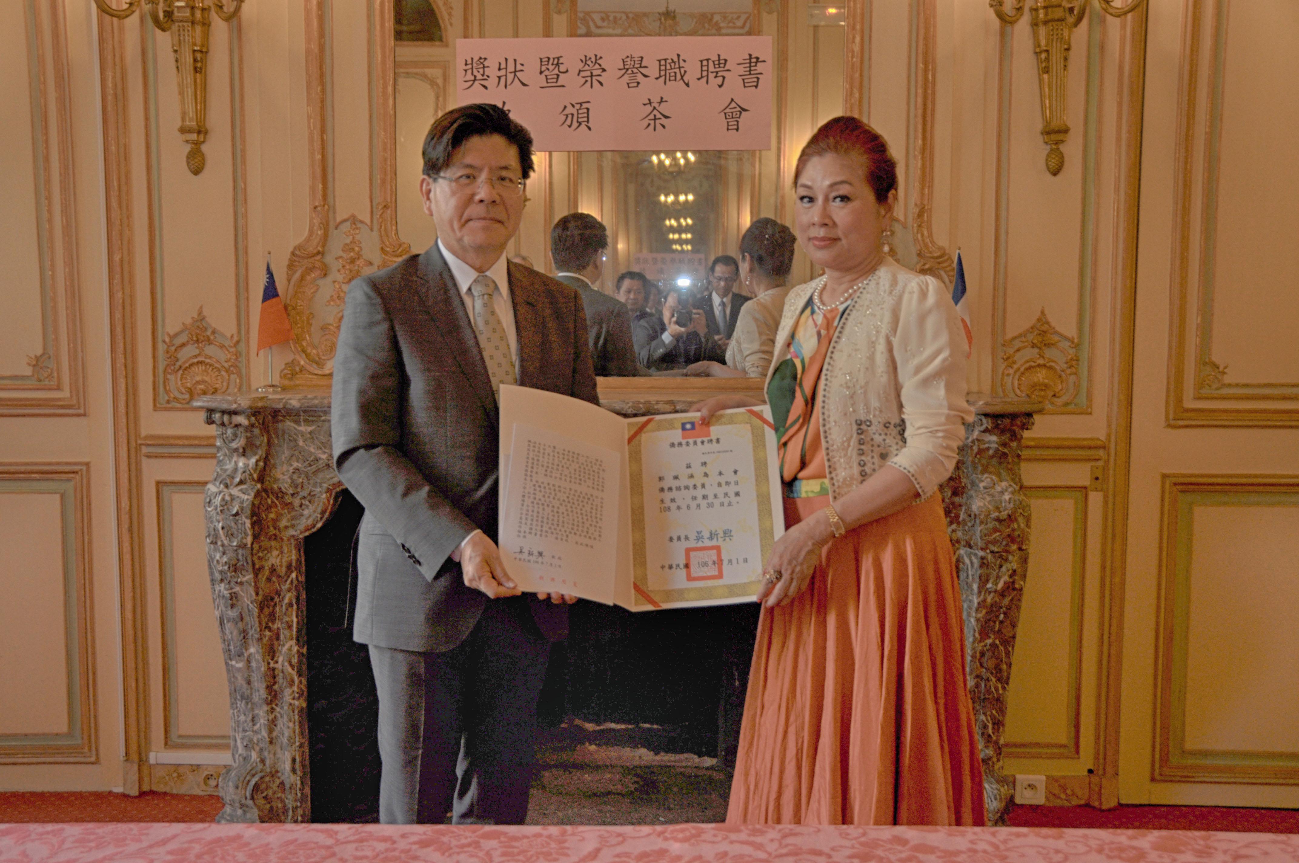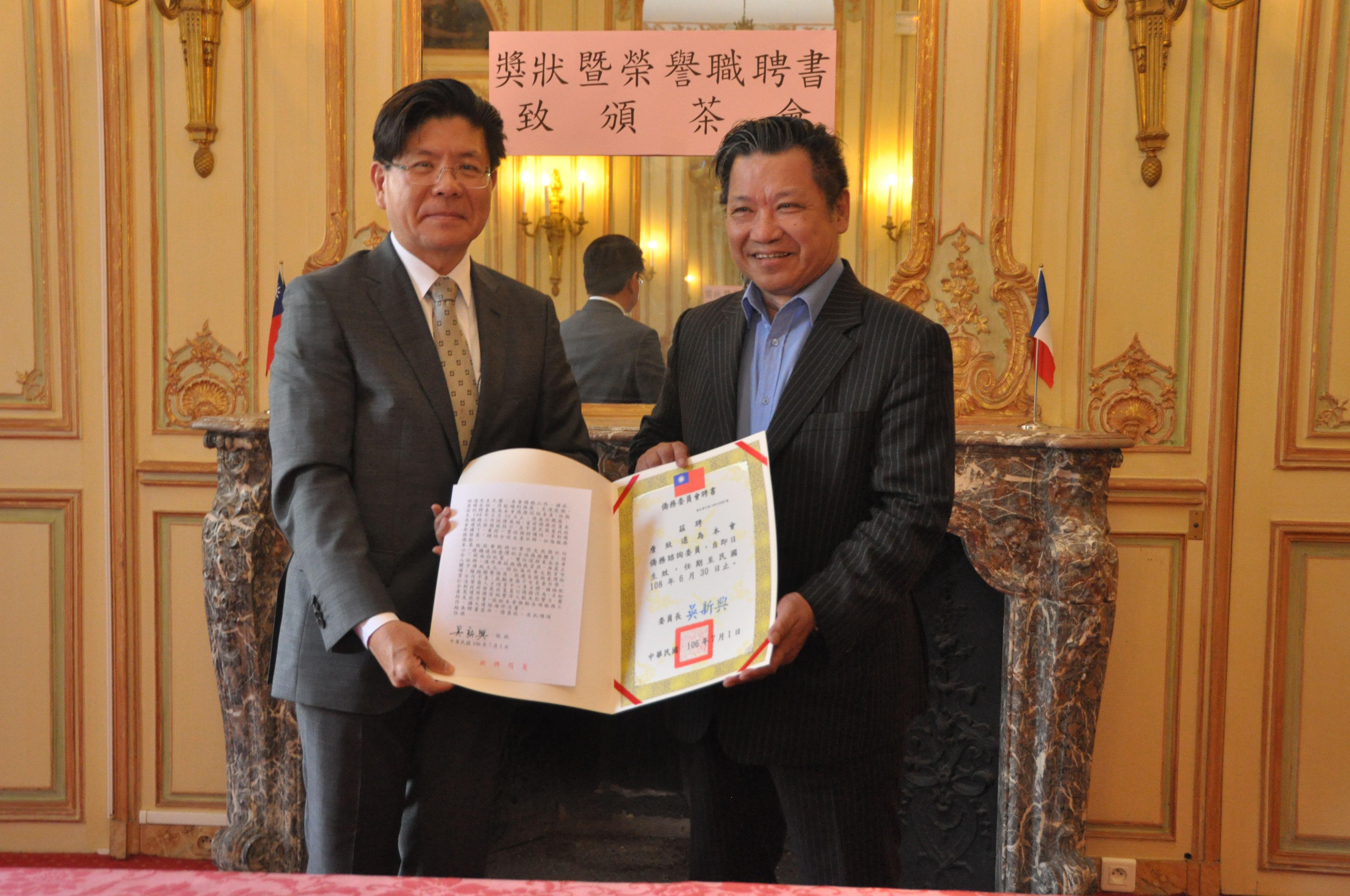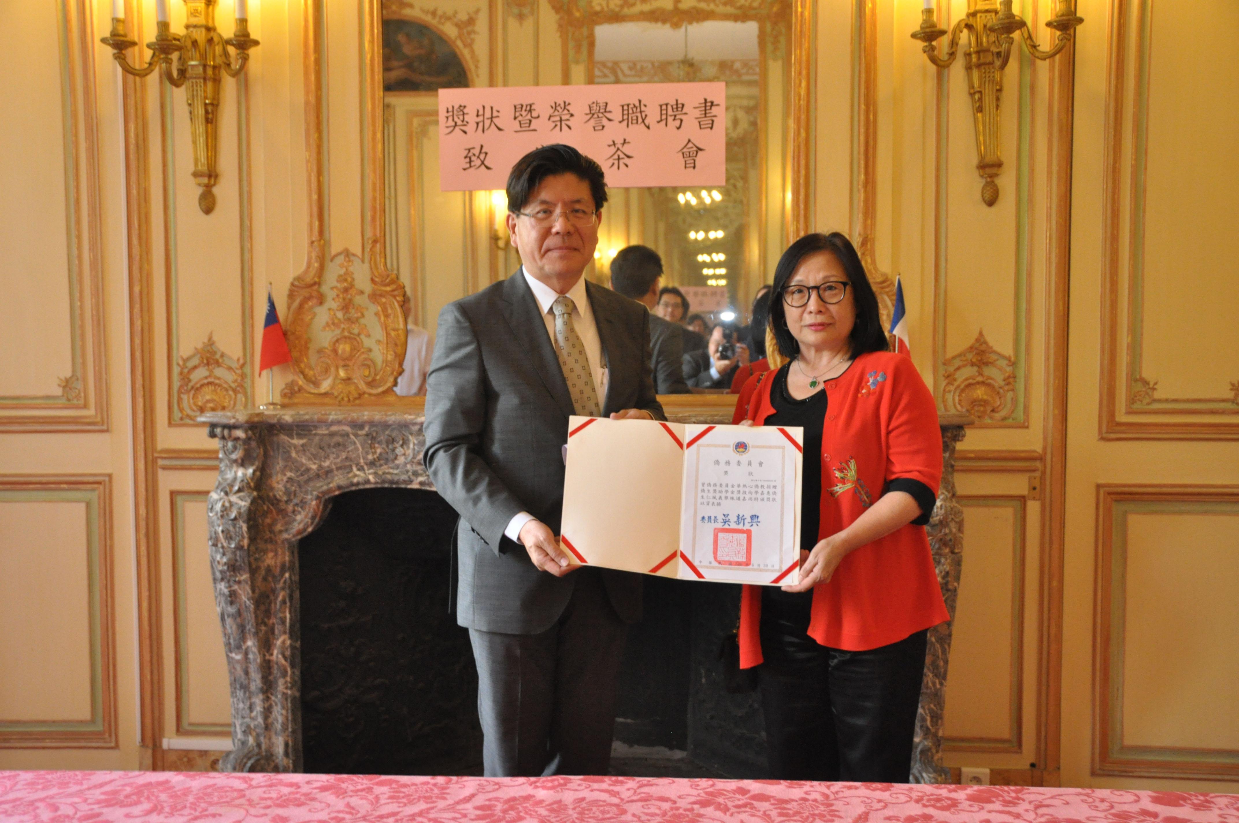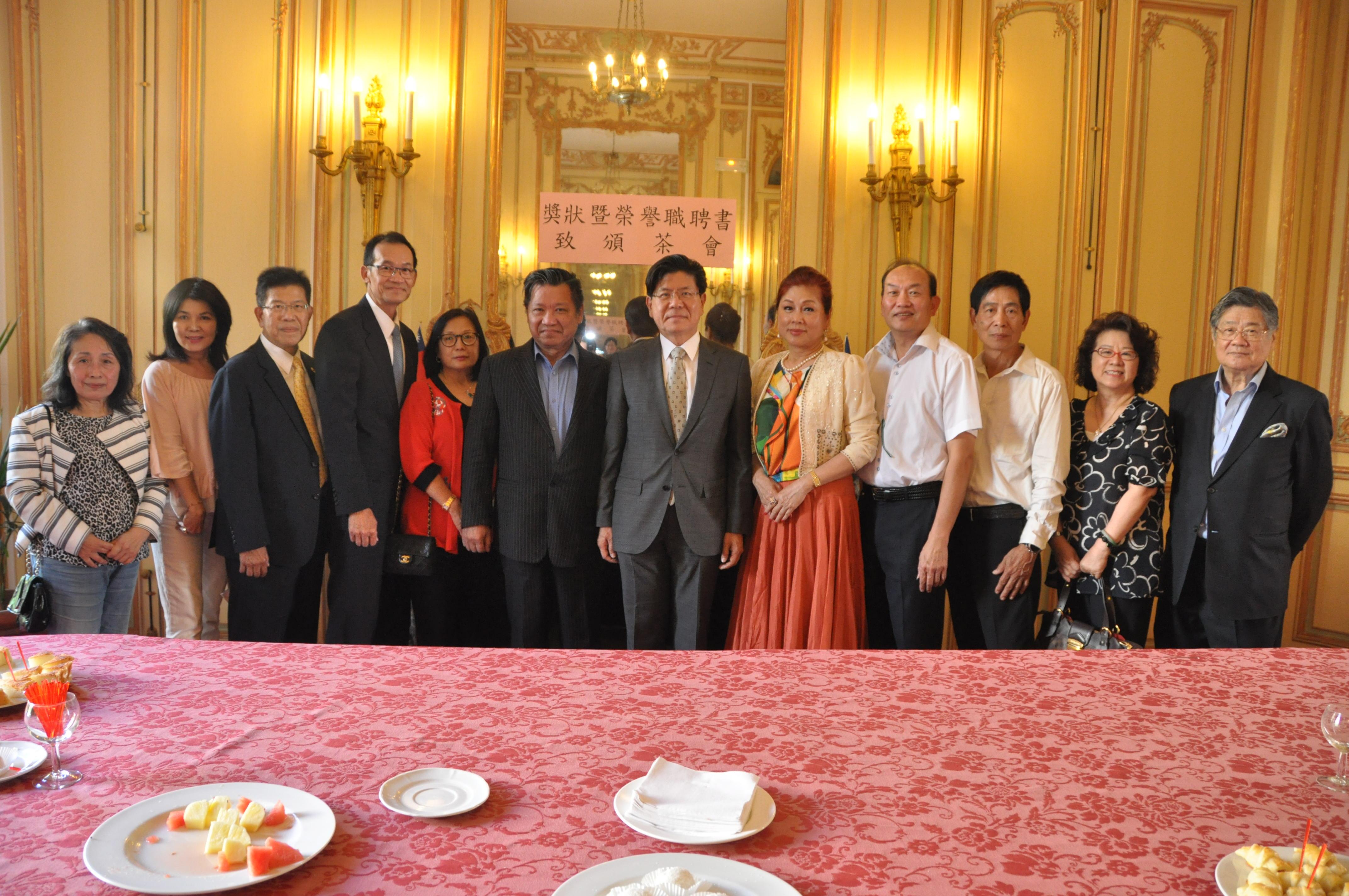 駐法國代表處於106年8月22日下午3時在會議室舉辦「獎狀暨榮譽職聘書致頒茶會」,由張銘忠大使親自主持;黃行德、黎輝、李永慶、曾輝、丘世璿、陳惠美、林寶寶、李河等旅法僑務榮譽職人員到場共襄盛舉,和代表處同仁一起觀禮。 張大使致詞表揚曾金華僑務委員熱心捐助僑生獎助學金新臺幣10萬元之仁風義舉,並肯定詹致遠、郭珮涵及施龍等3位旅法僑領服務僑社之績效顯著,祝賀他們榮獲僑務委員會聘任為僑務諮詢委員,讓旅法僑務榮譽職陣容更加壯盛。大使並期勉與會僑領繼續和代表處攜手共同促進僑社團結和諧,在既有的急難救助機制基礎上,與僑界關懷救助協會相輔相成,盼能在大巴黎地區以外增設至少10個聯絡點,由代表處正式委託當地熱心僑胞或留學生擔任聯絡人,配合政府擴大對僑界、旅外國人、度假打工青年及留學生的關懷與照顧。 曾金華委員致詞時指出:本次捐贈係結緣於5月返臺參加全球僑務會議時,她為配合政府新南向政策,鼓勵海外僑界幫助中南半島清寒學子完成學業,貢獻出自己一份心意,旨在拋磚引玉,日後會繼續發心,貢獻國家與僑社。 詹致遠及郭珮涵於獲頒僑務委員會聘書後,一致表示:「熱愛臺灣,支持中華民國」是海外僑胞一致的心意與堅持,獲聘為僑務諮詢委員代表一個更大的承擔與責任,會繼續服務僑眾,促進僑社團結、和諧、進步、發展與傳承,做為政府向上提升,推動外交工作的堅實後盾。此外,詹致遠也藉機說明,最近會同資深僑領丁偉星共同推動在法設立中山獎學金基金會,規劃提供三名碩、博士生獎學金及協促臺灣與非洲地區經濟合作交流計畫的進度。 儀式結束後,張大使偕古文劍公使暨相關同仁全程和與會僑務榮譽職人員互動,就彼此關切議題交流,分享彼此經驗與看法,互動熱絡,氣氛和諧。