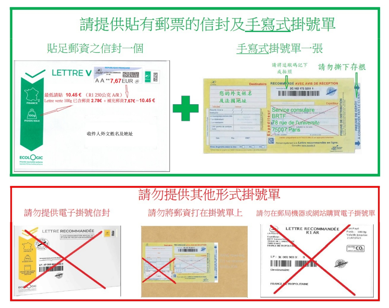 Tout dossier incomplet ou non-conforme reçu par courrier sera mis en attente et nous essayerons de vous contacter par téléphone pour vous informer des documents à compléter. Pour les dossiers pouvant être complétés par mail, merci d’envoyer le(s) document(s) manquant(s) à notre adresse mail brtf@mofa.gov.tw. Nous vous confirmerons ensuite par mail si votre dossier est complet. Pour les dossiers nécessitant d’être complétés par courrier (par exemple, envoi d’un chèque), merci de nous appeler (0144398820), 1-2 jours après votre envoi, pour vérifier si nous avons bien reçu le(s) document(s) manquant(s).