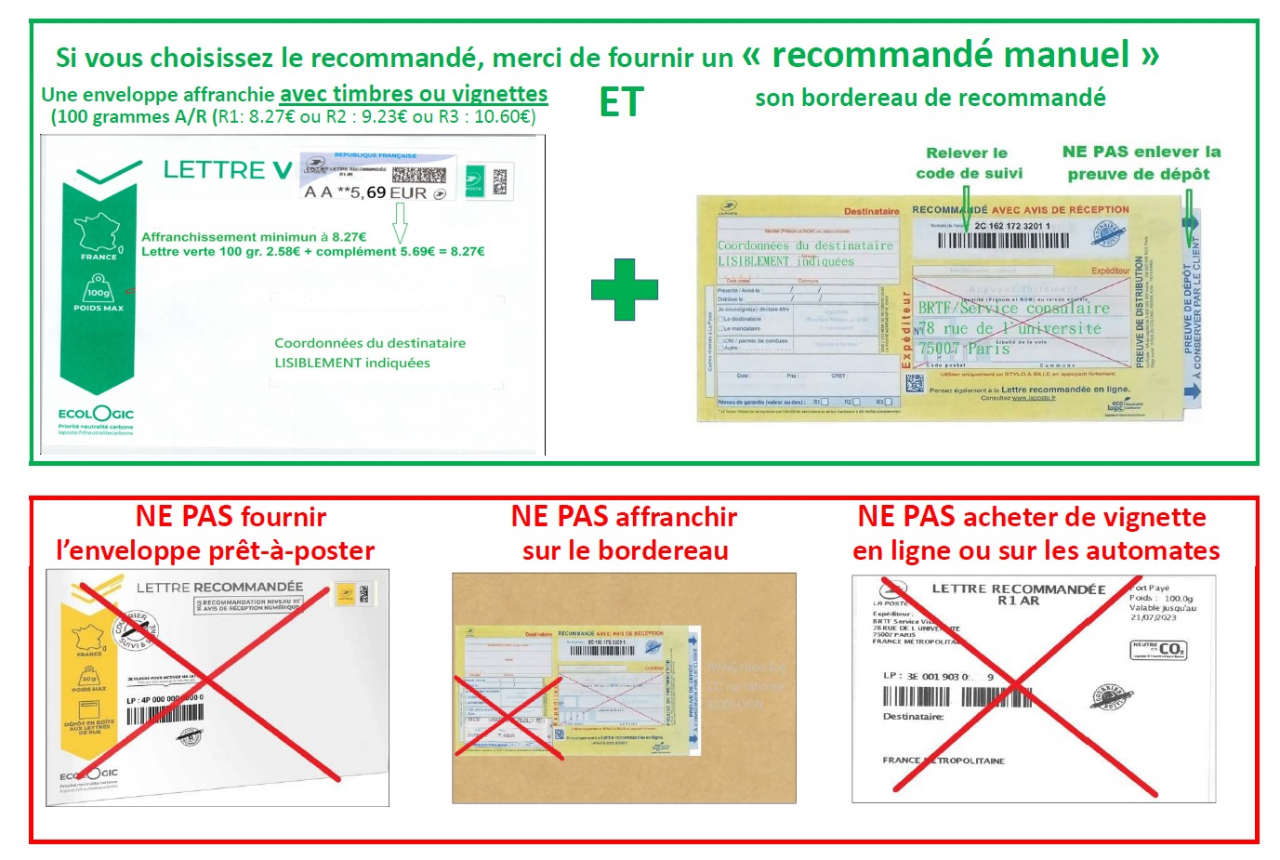 B.已填妥收件人姓名、地址及貼足250克雙掛號郵資信封一個(Recommandé A/R) 及已填妥收件人姓名、地址的手寫式雙掛號單一張(bordereau de recommandé A/R)(請見以下說明)