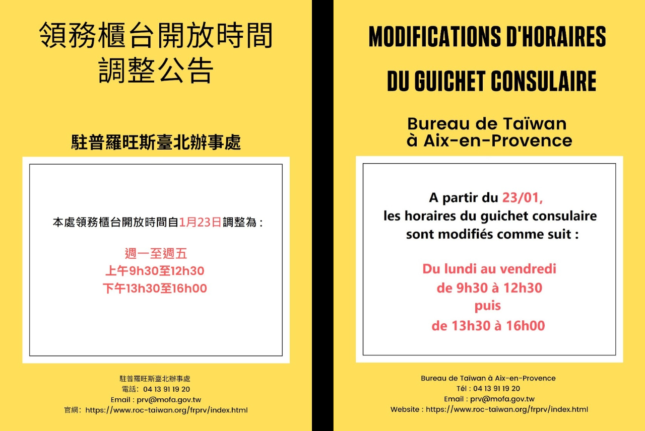 本處領務櫃台1月23日起調整開放時間為每日上午9H30至12H30、下午13H30至16H00,上下午均受理繳件、取件服務。