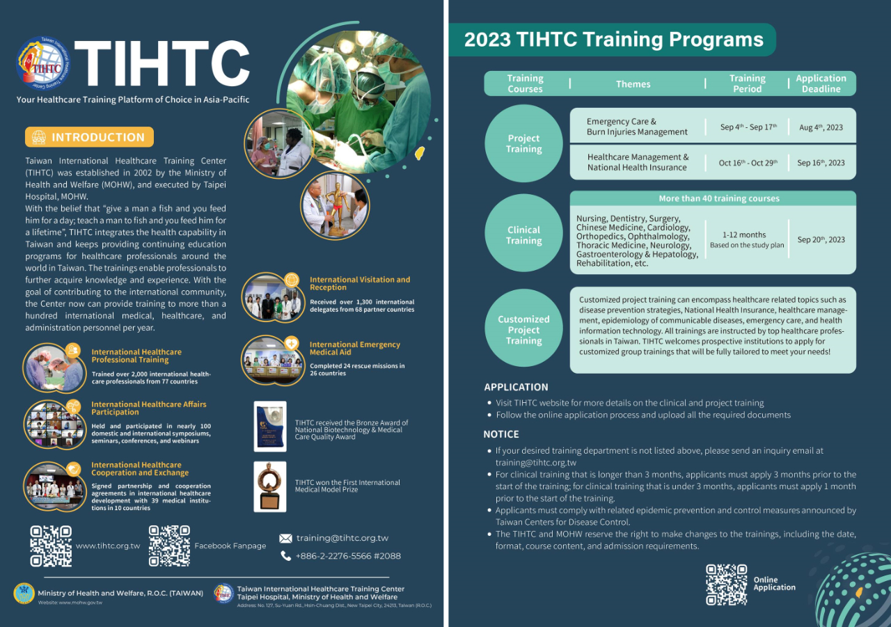 我國衛生福利部委託臺北醫院辦理112年「臺灣國際醫療衛生人員訓練中心」(TIHTC) 計畫培訓課程,自9月起舉辦「緊急醫療暨燒燙傷照護」及「醫務管理暨全民健康保險」等專案課程,有意參訓者可赴TIHTC網站或洽聯絡窗口 (衛福部臺北醫院江主任,電話:02-2276-5566分機2088,電子信箱:training@tihtc.org.tw)。