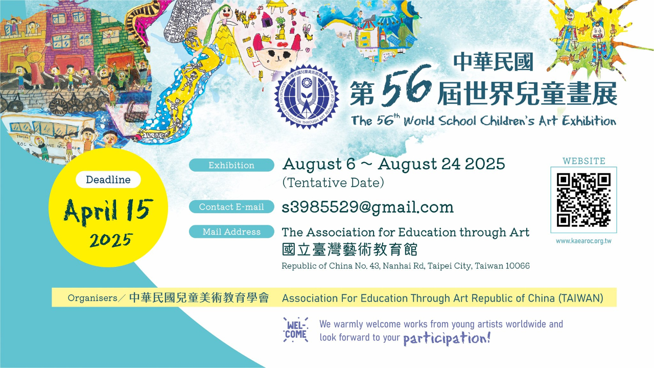 中華民國兒童美術教育學會於今(2025)年辦理第56屆世界兒童畫展,邀請全世界3-15歲學童提供作品參展,即日起至4月15日止受理報名。優勝作品將於今年8月6至24日(暫定)在國立臺灣藝術教育館展出喔!