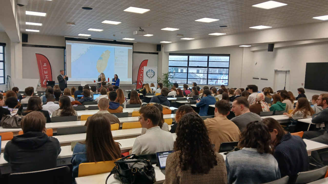 沈處長真宏本(114)年3月24日應邀赴里昂國際與政治高等學院 (HEIP) 與該校青年學子分享台灣經驗,沈處長除簡介本處設於南法所轄業務與近年推動雙邊交流之具體事蹟,同時宣導我度假打工、國際攬才與就業金卡等政策,嗣應學生詢問,逐一說明我歷史淵源、政經發展現況及台灣在全球地緣政治中所扮演之關鍵角色等議題。當日宣講吸引近百人聆聽,互動熱烈,沈處長夫人更準備親手烘培之台式鳳梨酥供在場學生取用,廣獲一致好評。