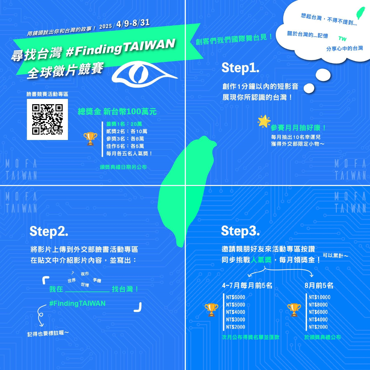 (1) 拍影片上傳至臉書專區,貼文標註 #FindingTAIWAN,並分享「我在___(例如:艾克斯/ 珍奶…)找台灣」或「I am #FindingTAIWAN ___(in Aix/ bubble tea…)」 (2) 填寫報名表單:https://forms.gle/tsAZmM2FcwR1rznv7 (3) 務必記得再電郵本處(prv@mofa.gov.tw),告知已填妥並提供上述報名資料。