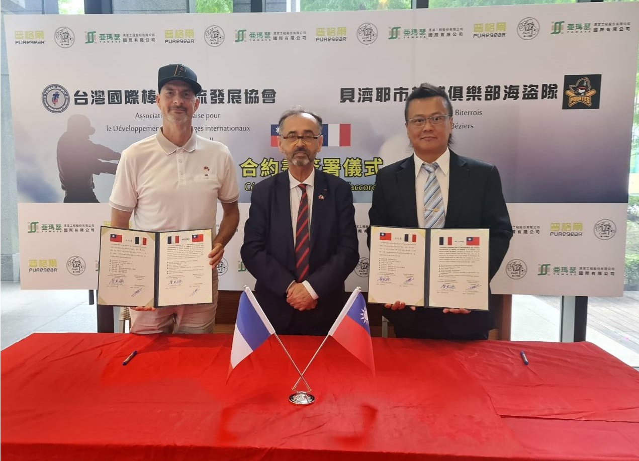 法國南部的貝濟耶市(Béziers)棒球暨壘球俱樂部海盜隊總裁柏內(François BONNET)本(7)月15日隨該市梅納爾市長應我政府邀請抵台訪問,今(16)日上午拜會台灣國際棒球交流發展協會,在梅納爾市長見證下,代表海盜隊與協會理事長黃思傑簽署雙邊交流合約書,計畫未來3年內以球會友,推動雙方球隊互訪切磋及人員訓練交流。