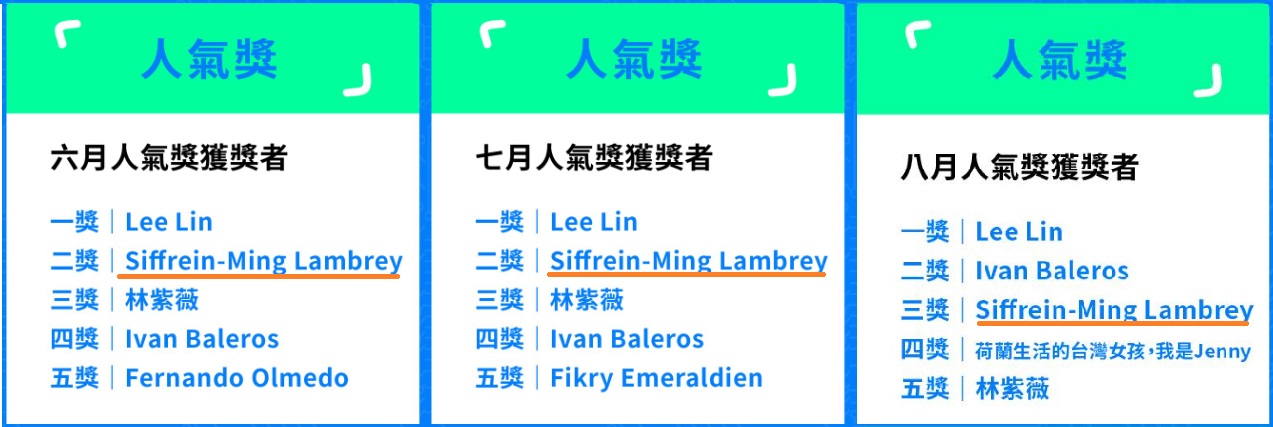 此次徵件活動歷時4個月,共收到來自全球21國的283件影音作品,題材橫跨文化交流、秀麗風景、民眾生活、旅遊記憶與濃厚人情味,呈現不同視角所見的多元台灣。其中法國南部艾克斯普羅旺斯 (Aix-en-Provence) 的參加者 Siffrein-Ming Lambrey,自6月2日向駐普羅旺斯辦事處投稿以來,其作品"TAIWAN, THE BEAUTY OF INNER SILENCE"接連獲選本活動6、7、8月的人氣獎前三名,更成為代表法國入圍最終決選的20部影片之一,即將角逐9月26日頒獎典禮揭曉的11項大獎 (首獎由外交部長林佳龍親自頒發)。
