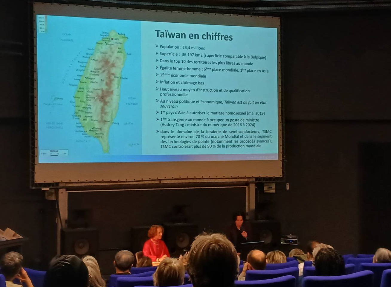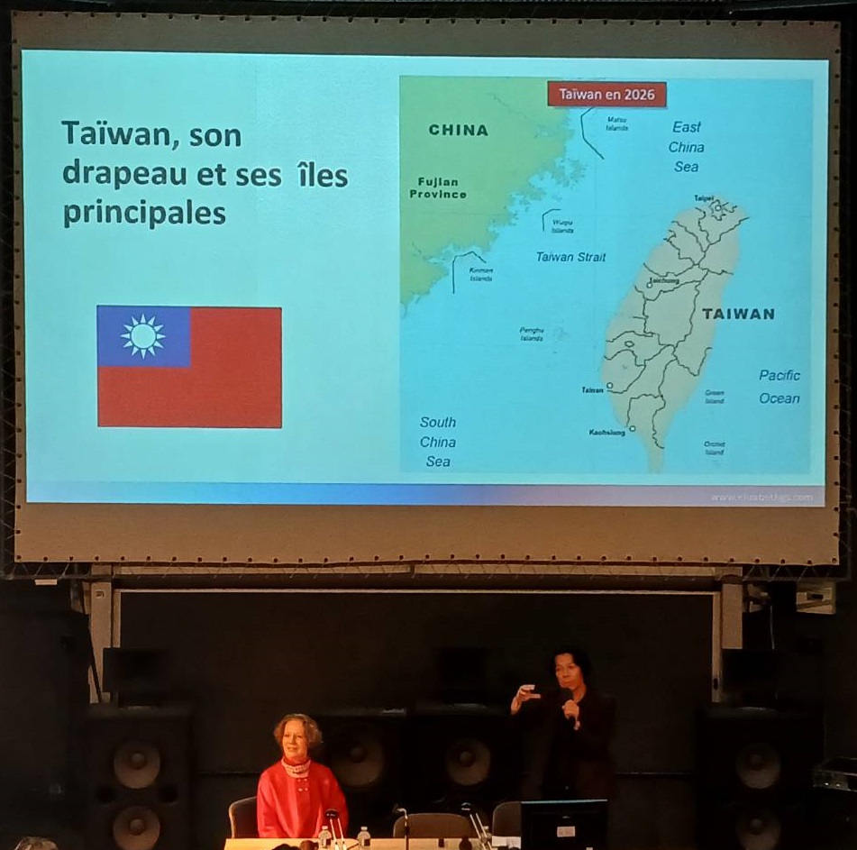 La première partie de soirée a été lancée par Mme Spennato et le Professeur Liu Chan-yue (chaire en études taïwanaises, Inalco). Dans un français fluide, M. Liu a débuté son intervention en proposant à l'auditoire — plus de 80 personnes — une introduction linguistique : il a évoqué l'étymologie du mot "Taïwan", le rôle central de l'île en tant que foyer ancestral et centre de dispersion des langues austronésiennes, ainsi que la répartition géographique de ses 17 peuples autochtones. Statistiques à l'appui, il a dressé de manière vivante et concise un portrait de Taïwan, rappelant à l'occasion que la chaire en études taïwanaises (un sujet qu'il promeut activement depuis nombre d'années à Paris) collaborait désormais avec des établissements d'enseignement supérieur taïwanais pour mettre en place une plateforme d'apprentissage en ligne. Cette plateforme propose 17 cours gratuits couvrant plusieurs langues dont le taïwanais (taigi), le hakka taïwanais et les langues austronésiennes taïwanaises. Il a invité le public français à utiliser cette ressource comme porte d'entrée vers une compréhension plus approfondie de la culture formosane.