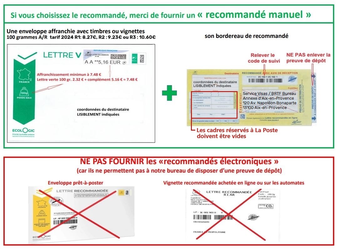 Merci d’indiquer lisiblement les nom/prénom et adresse du destinataire sur les enveloppes pour éviter tout incident lié à l’envoi et à la réexpédition de votre dossier (en l’occurrence votre passeport). Notre service n’est, en aucun cas, responsable de la perte ou du retard d’acheminement de vos documents par la poste.