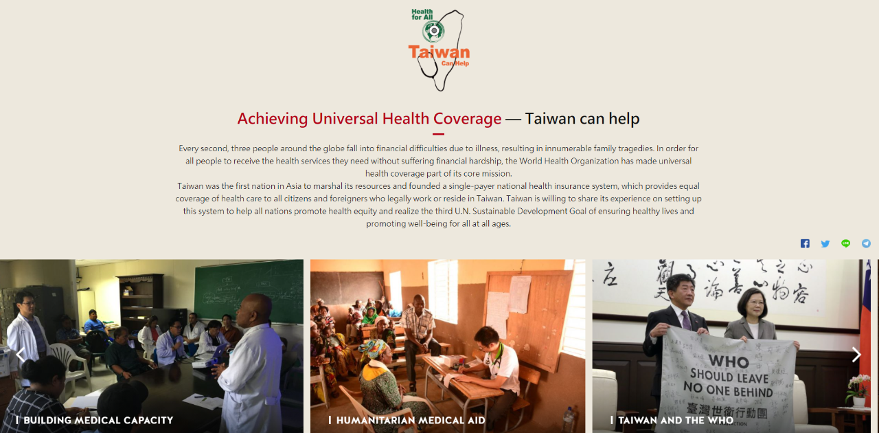 Taïwan a été le premier pays d'Asie à mobiliser ses ressources pour un système national d'Assurance Maladie à payeur unique, pour tous les citoyens et étrangers travaillant ou résidant légalement sur son territoire. Taïwan est prêt à partager l'expérience de mise en place de ce système, afin d'aider toutes les nations à réaliser l'Objectif de développement durable n°3 des Nations unies.