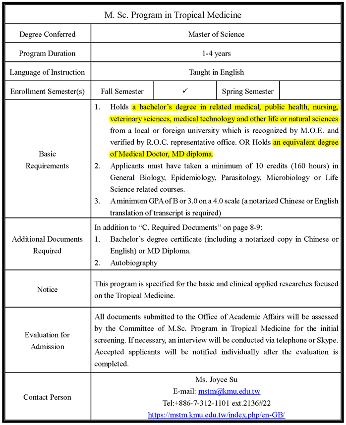 Enseigné en anglais, le programme est ouvert à tout détenteur/détentrice d'une licence (Bachelor's degree) en médecine, santé publique, soins infirmiers, sciences vétérinaires, technologies médicales, biosciences ou autres sciences naturelles concernées, émise par une université locale ou étrangère reconnue par le Ministère taïwanais de l'Education puis attestée par la représentation taïwanaise compétente. L'Université accepte également le diplôme de Docteur en médecine (Medical Doctor, MD) ou équivalent. Les conditions restantes sont à retrouver sur ce tableau.