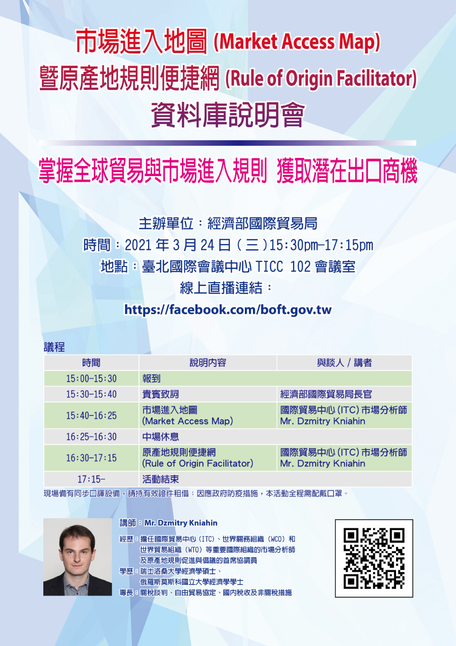 經濟部國際貿易局訂於110年3月24日下午3時30分,於台北國際會議中心(TICC)舉辦「市場進入地圖(Market Access Map)及原產地規則便捷網(Rule of Origin Facilitator)資料庫說明會」,歡迎報名參加。