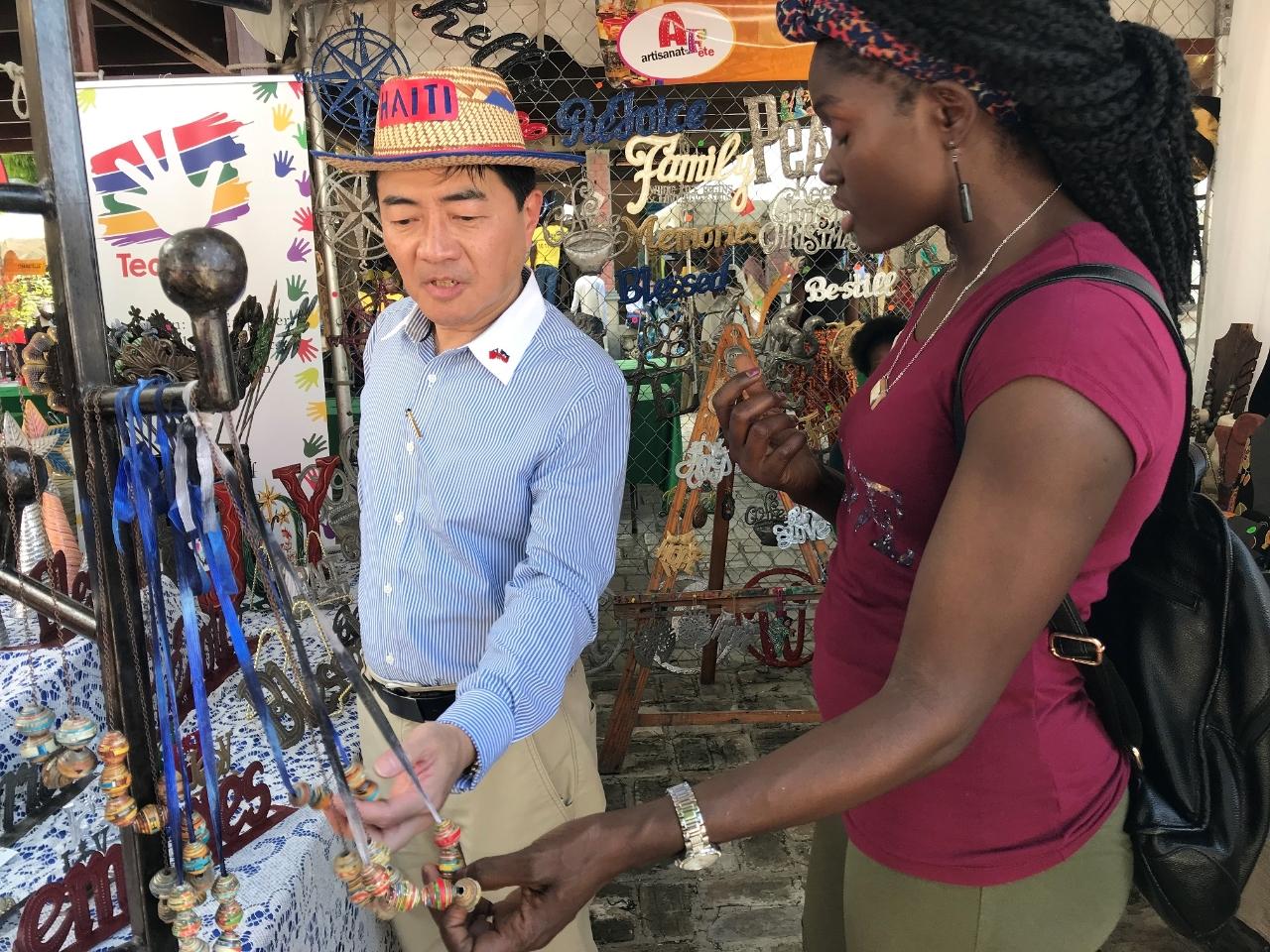 107.11.10駐海地大使胡正浩赴太子港市「甘蔗歷史公園」參訪「手工藝博覽會」,與手工藝者交流。
