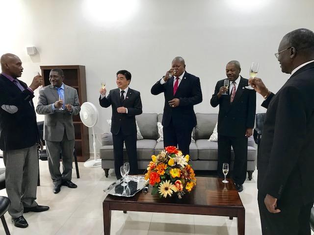 胡大使拜會海地最高法院,院長René Sylvestre(右3)偕副院長Louis Pressoir Jean-Pierre(右2)、該院大法官及法官等以香檳歡迎熱忱接待。