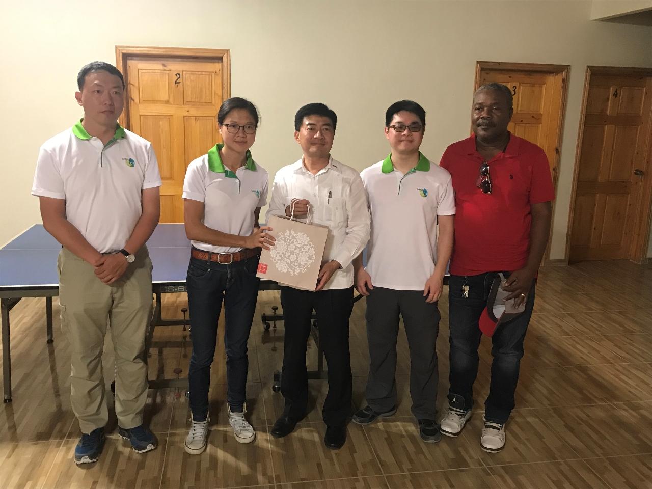 胡大使(中)探視駐海技術團何計畫經理佳玲(左二)、黃技師繼正(右二)、張技師瑞炘(左一)以及海方經理Yvonne Etienne(右一)等團員。