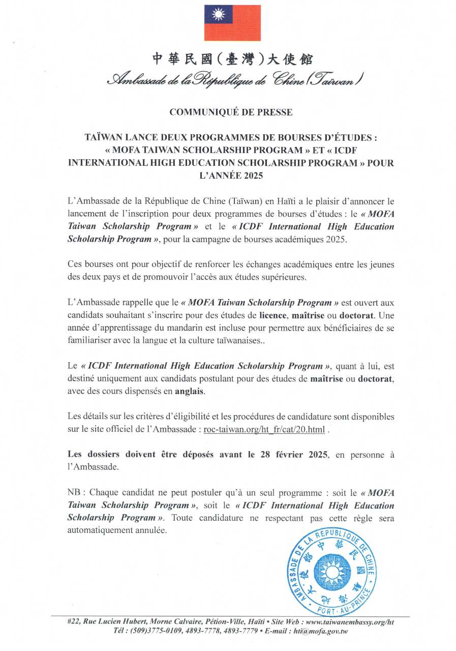 250129_「外交部臺灣獎學金」及「ICDF國際高等人力培訓獎學金計畫」即日起開放收件至2... - 駐海地共和國大使館 Ambassade de la République de Chine (Taïwan) en Haïti ::: 跳到主要內容區塊