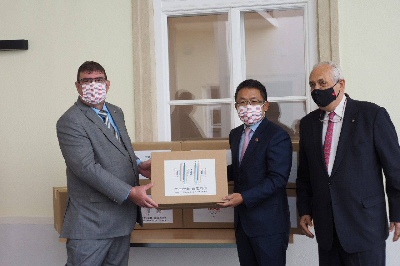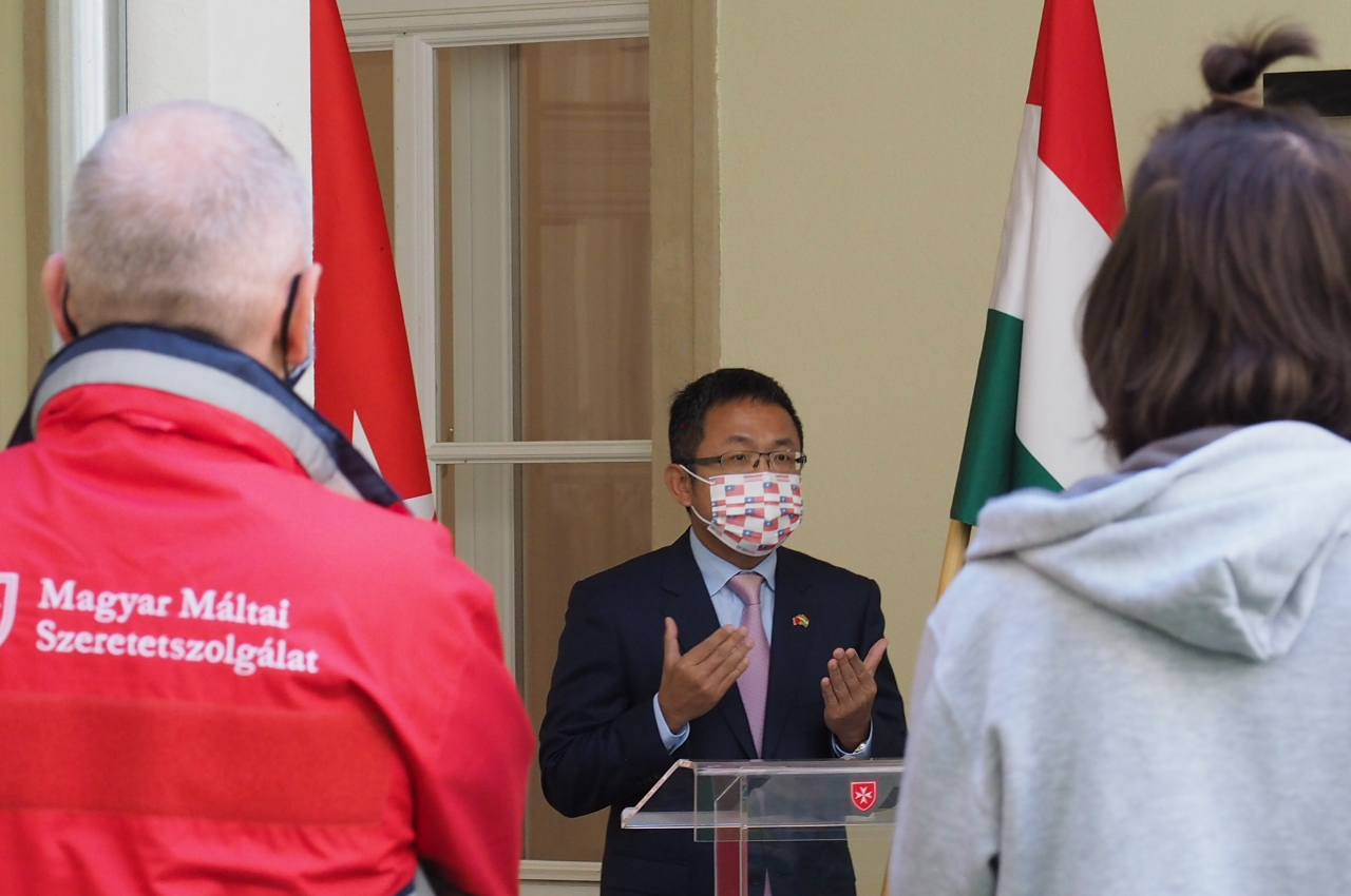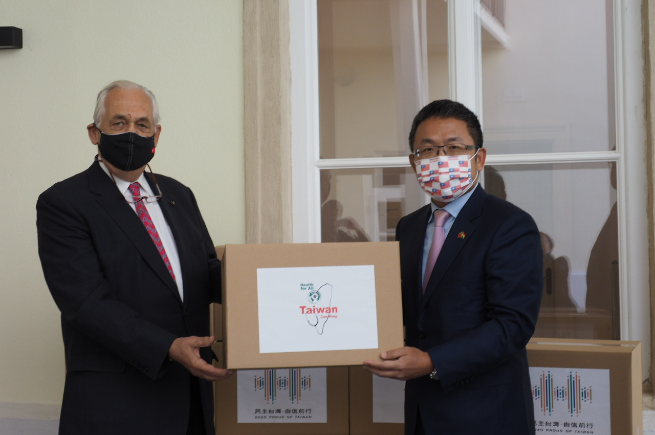 台灣駐匈牙利大使劉世忠,10月8號上午和馬爾他騎士團派駐匈牙利大使烏格隆(Imre Ugron)聯袂到騎士團駐匈國的醫療社會福利協會總部,捐贈3,000個口罩給協會內的養老院及遊民醫療中心,由副總會長Lajos Gyori-Dani代表接受。